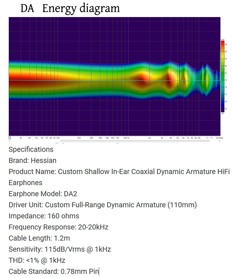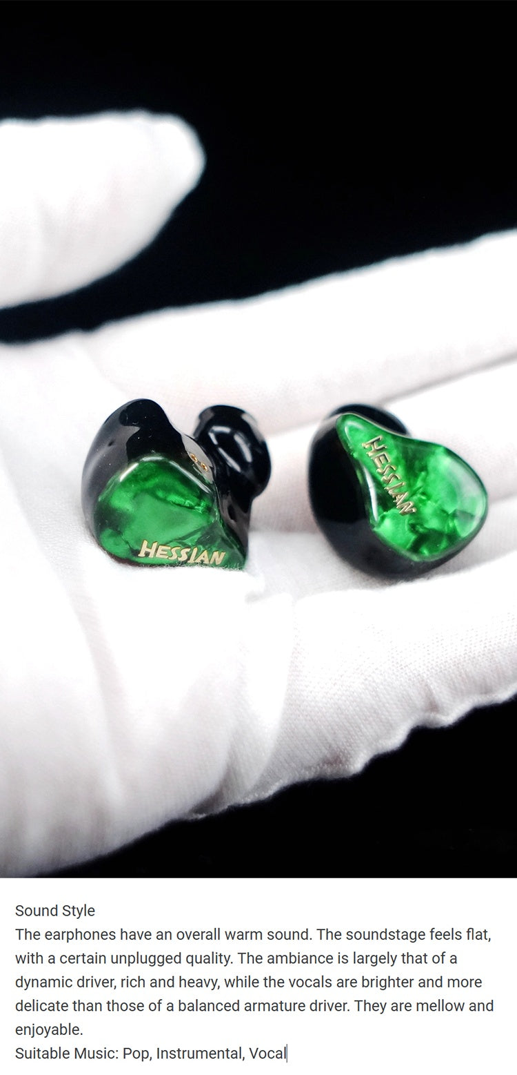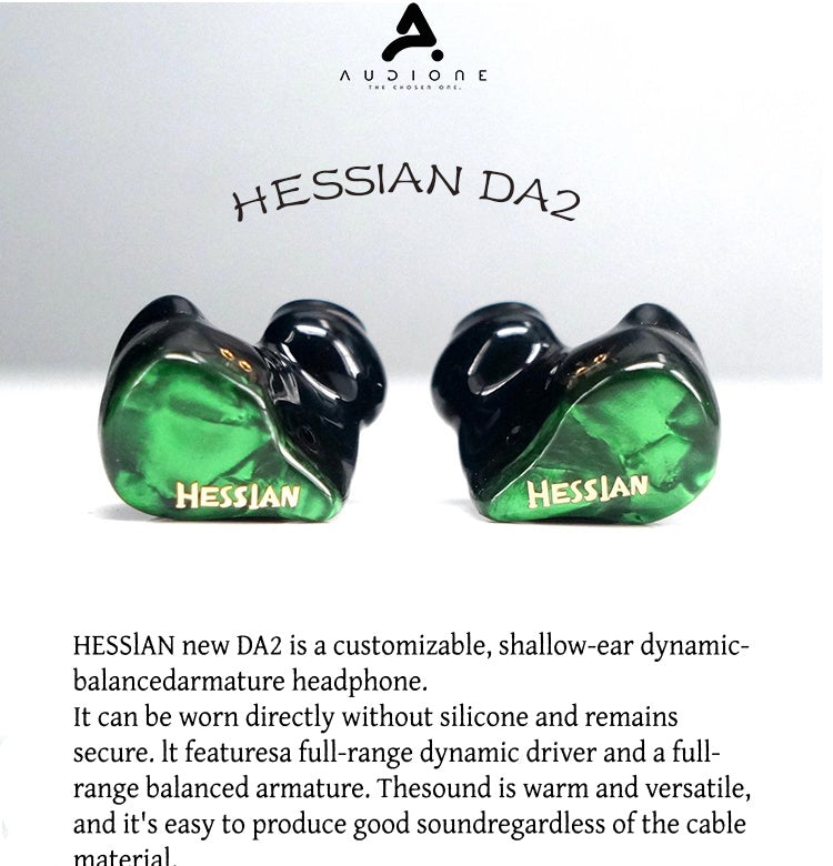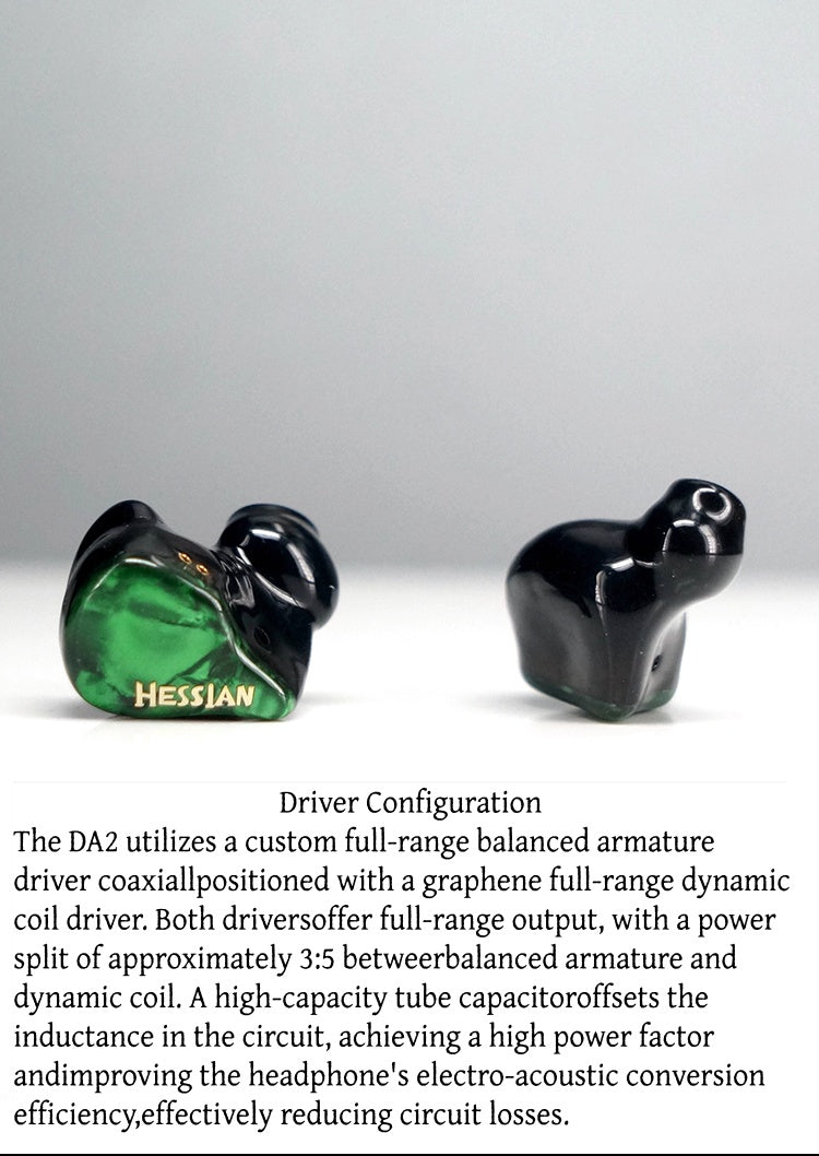 HESSlAN new DA2 is a customizable, shallow-ear dynamic-balance darmature headphone.It can be worn directly without silicone and remainssecure. lt featuresa full-range dynamic driver and a full-range balanced armature. Thesound is warm and versatile,and it's easy to produce good soundregardless ofthe cablematerial