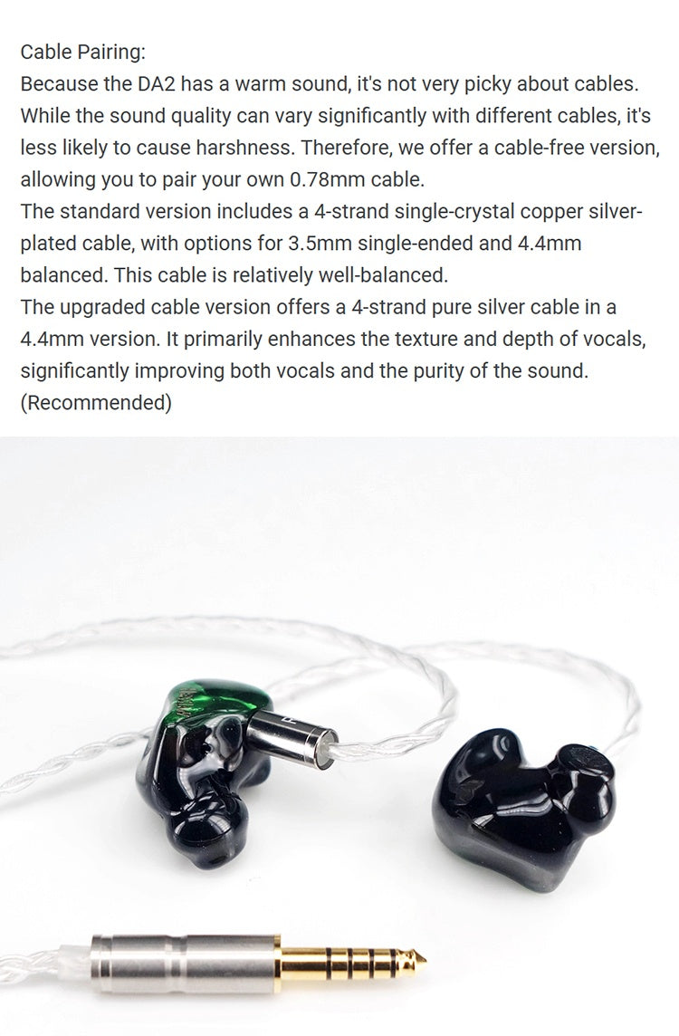 Because the DA2 has a warm sound, it's not very picky about cablesWhile the sound quality can vary significantly with different cables, it'sless likely to cause harshness. Therefore, we offer a cable-free version,allowing you to pair your own 0.78mm cable.The standard version includes a 4-strand single-crystal copper silver-plated cable, with options for 3.5mm single-ended and 4.4mmbalanced. This cable is relatively well-balanced.The upgraded cable version offers a 4-strand pure silver cable in a4.4mm version. lt primarily enhances the texture and depth of vocals,significantly improving both vocals and the purity of the sound.(Recommended)