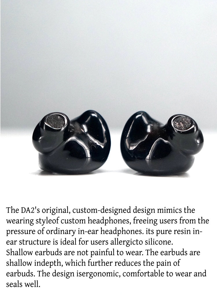 The DA2's original, custom-designed design mimics thewearing styleof custom headphones, freeing users from thepressure of ordinary in-ear headphones, its pure resin in-ear structure is ideal for users allergicto silicone.Shallow earbuds are not painful to wear, The earbuds areshallow indepth, which further reduces the pain ofearbuds. The design isergonomic, comfortable to wear andseals well