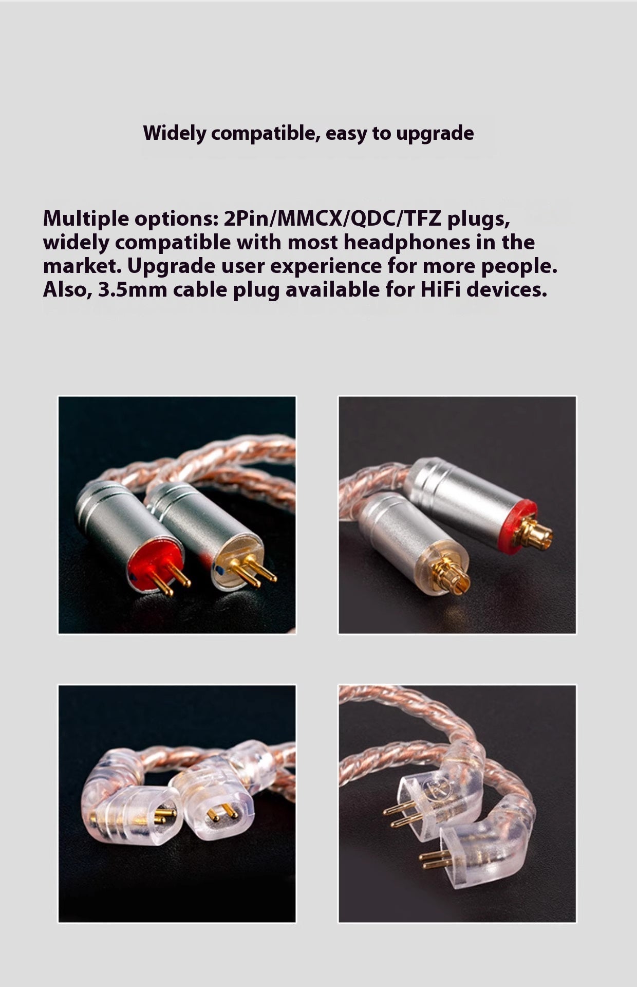 Multiple options: 2Pin/MMCX/QDC/TFZ plugswidely compatible with most headphones in themarket.Upgrade user experience for more people.Also, 3.5mm cable plug available for HiFi devices.
