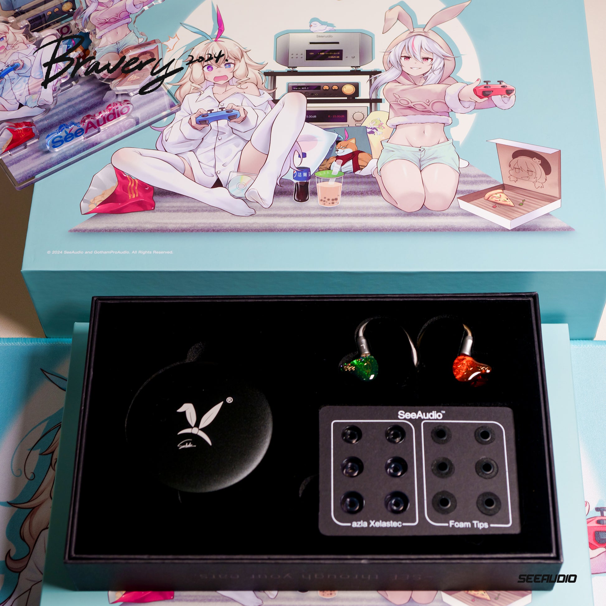 Choosing Bravery'24 means receiving not only a high-quality pair of earphonesbut also a beautifully designed gift box. We have specially included a refnedacrylic stand and an exclusively designed mouse pad. Each gift is carefully se-lected to match your exquisite taste. More than just earphones, it's a wonderfulgift to yourself.