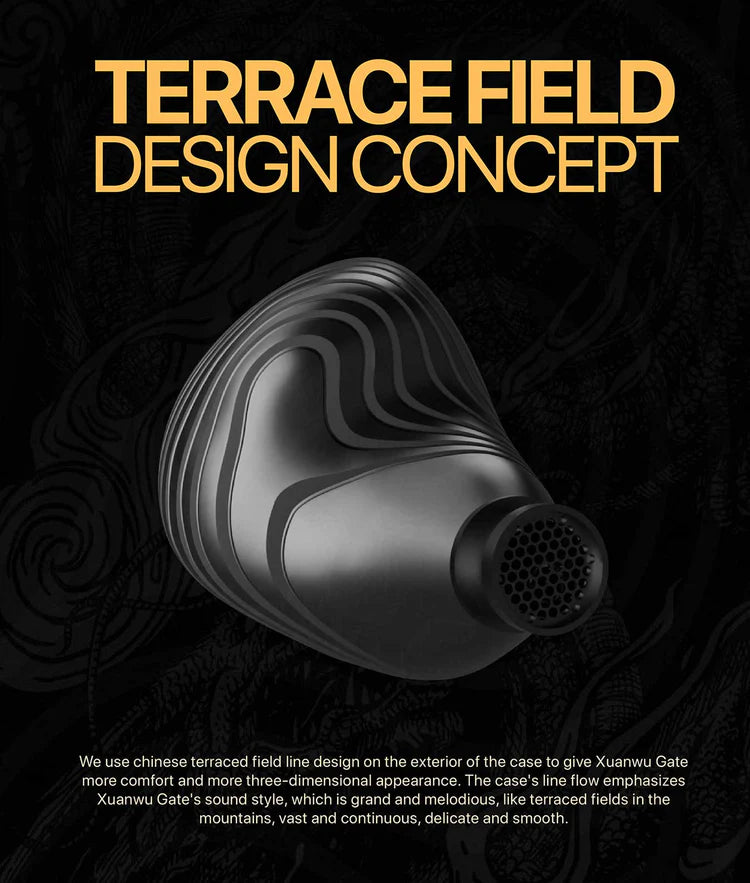 We use chinese terraced fleld line deslgn on the exterlor of the case to give Xuanwu Gatemore comfort and more three-dimensional appearance, The case's line flow emphasizesXuanwu Gate's sound style, which is grand and melodious, like terraced fields in themountains, vast and continuous, delicate and smooth.