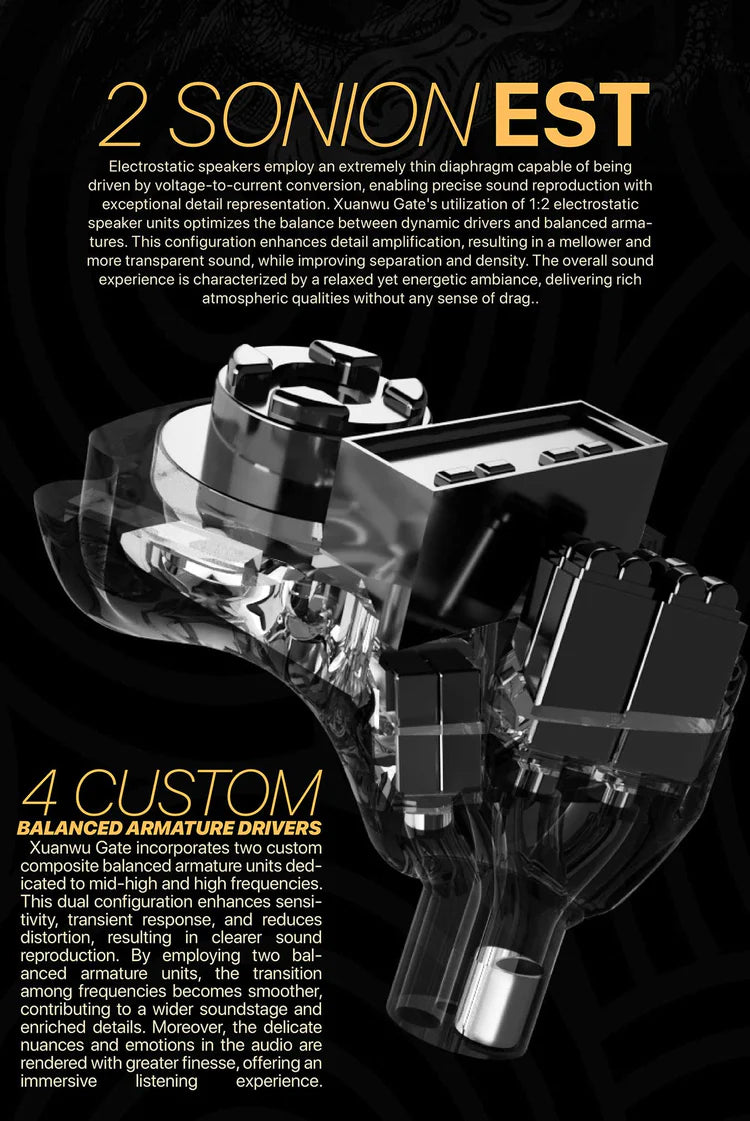 Electrostatic speakers employ an extremely thin diaphragm capable of beingdriven by voltage-to-current conversion, enabling precise sound reproduction withexceptional detal representation, Xuanwu Gate's utilization of 1:2 electrostaticspeaker units optimizes the balance between dynamic drivers and balanced armatures, This configuration enhances detall amplification, resulting in a mellower andmore transparent sound, while improving separation and density, The overall soundexperience is characterized by a relaxed yet anergetic ambiance, delivering richatmospheric gualities without any sense of drag.