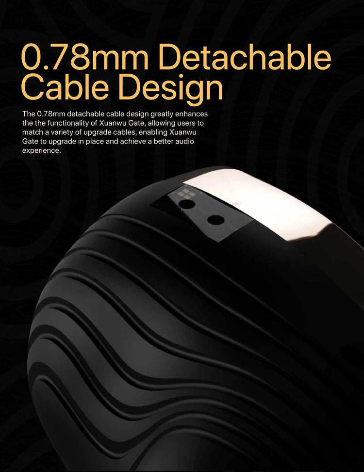 The 0.78mm detachable cable design greatly enhancesthe the functionality of Xuanwu Gate, allowing users tomatch a wanety of upgrade cables, enabling XuanwuGate to upgrade in place and achieve a better audioexpeпence.