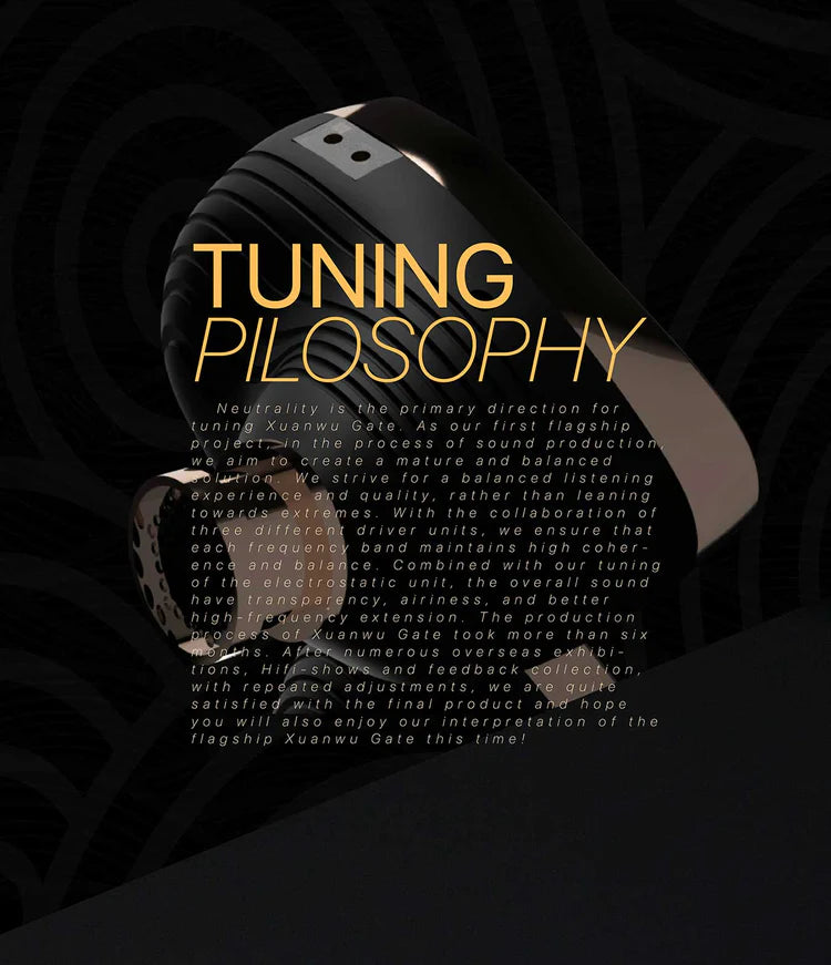Xuanwu Gate incorporates two customcomposite balanced armature units ded-icated to mid-high and high frequencies.This dual configuration enhances sensi-tivity, transient response, and reducesdistortion,resulting in clearer soundreproduction. By employing two bal-anced armature units, the transitionamong frequencies becomes smoother,contributing to a wider soundstage andenriched details. Moreover, the delicatenuances and emotions in the audio arerendered with greater finesse, offering anlisteningmmersiveexpeпence