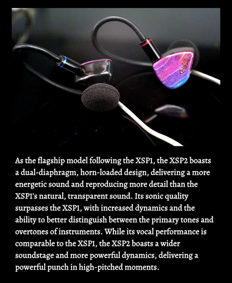 As the flagship model following the XSPl, the XSP2 boastsa dual-diaphragm, horn-loaded design, delivering a moreenergetic sound and reproducing more detail than theXSPl's natural, transparent sound. Its sonic qualitysurpasses the XSPl, with increased dynamics and theability to better distinguish between the primary tones andovertones ofinstruments. While its vocal performance iscomparable to the XSPl, the XSP2 boasts a widersoundstage and more powerful dynamics, delivering apowerful punch in high-pitched moments.