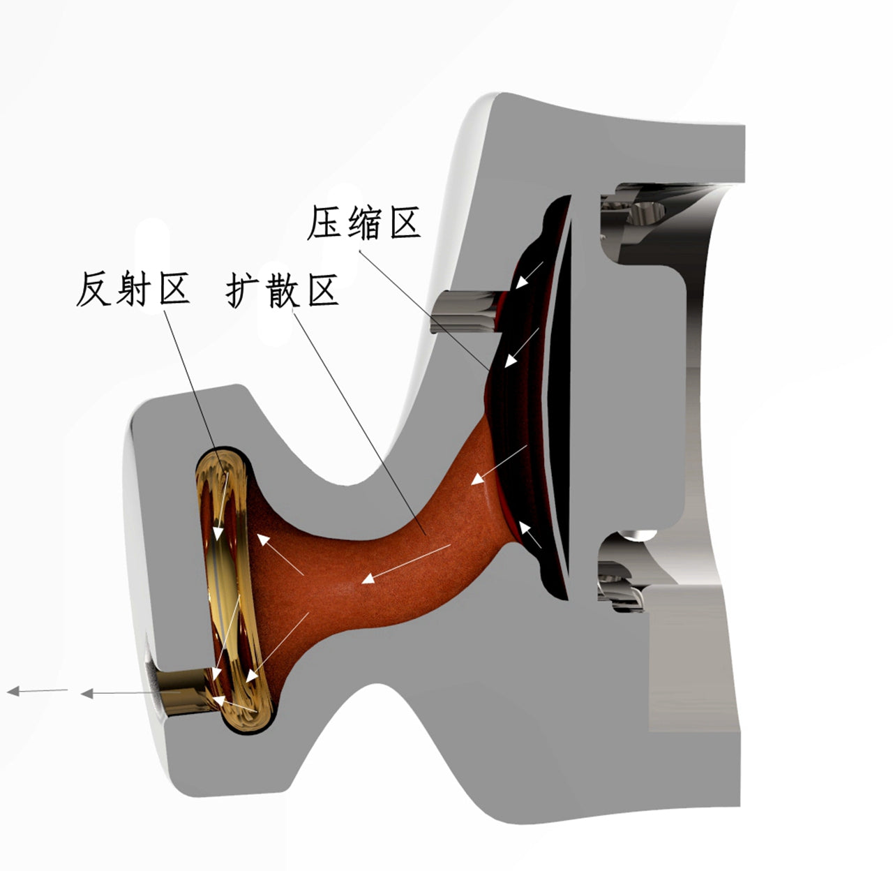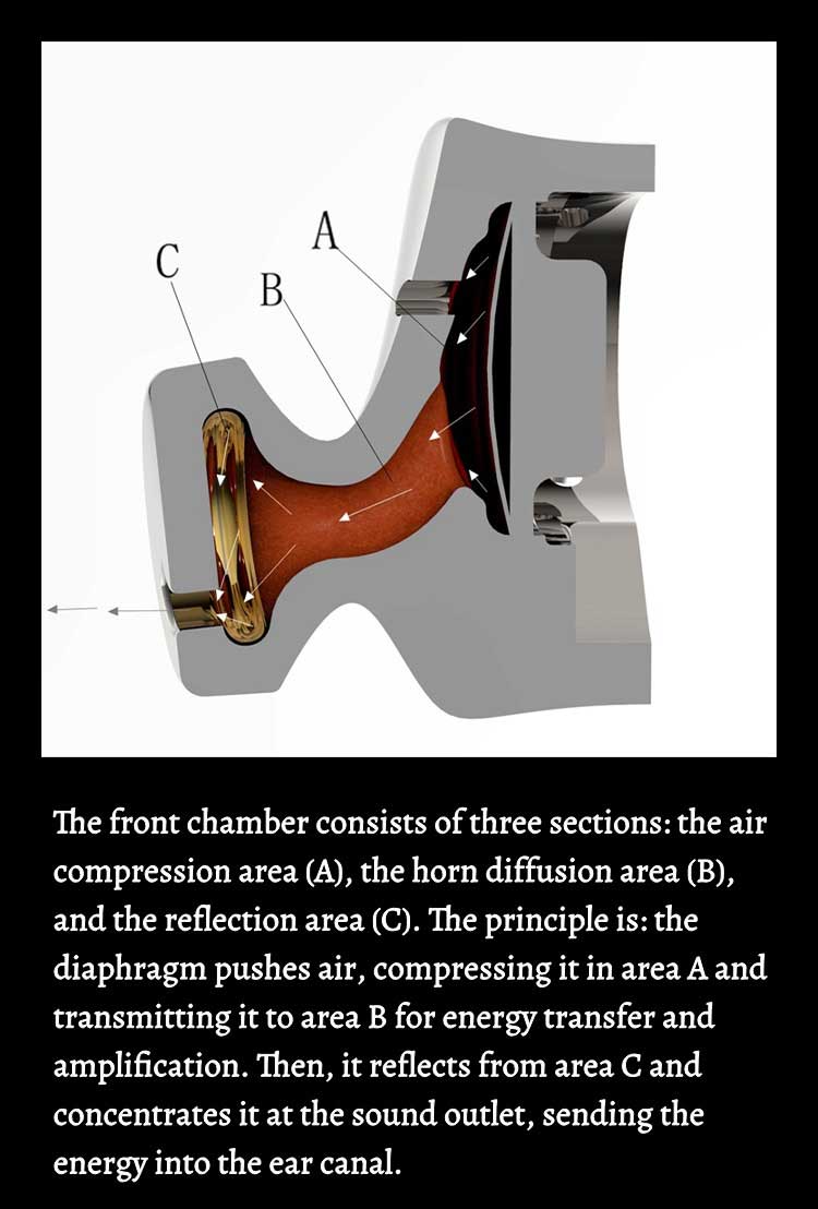 The front chamber consists ofthree sections: the aircompression area (A), the horn diffusion area (B),and the reflection area (C). The principle is: thediaphragm pushes air, compressing it in area A andtransmitting it to area B for energy transfer andamplifcation. Then, it reflects from area C andconcentrates it at the sound outlet, sending theenergy into the ear canal.