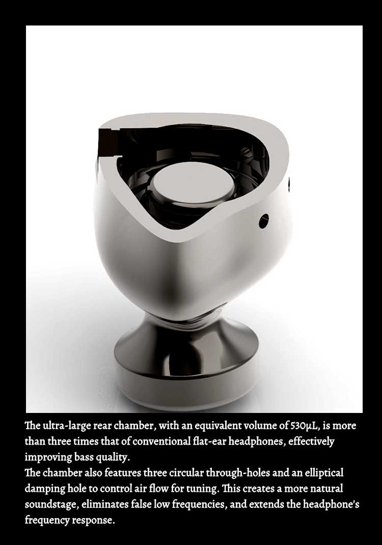 The ultra-large rear chamber, with an equivalent volume of530μL, is morethan three times that ofconventional flat-ear headphones, effectively improving bass quality.