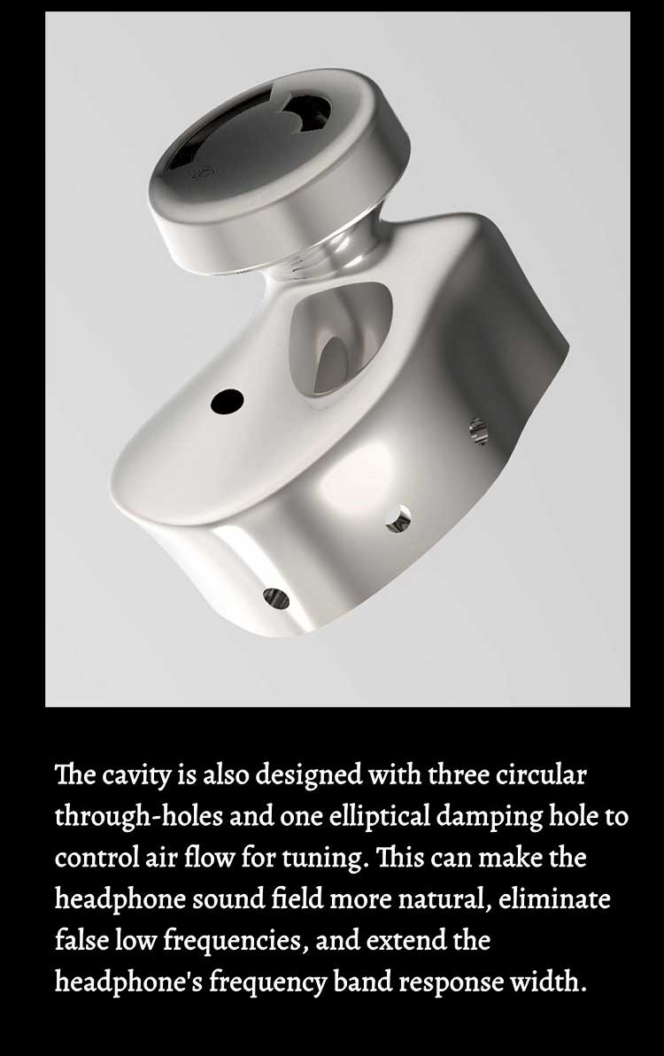 The cavity is also designed with three circularthrough-holes and one elliptical damping hole tocontrol air flow for tuning. This can make theheadphone sound field more natural, eliminatefalse low frequencies, and extend theheadphone's frequency band response width.