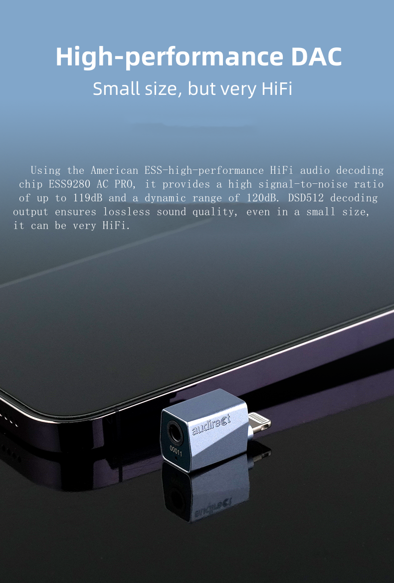 Using the American ESS-high performance HiFi audio decodingchip ESS9280 AC PRO, it provides a high signal-to-noise ratioof up to ll9dB and a dynamic range of 120dB. DSD512 decodingoutput ensures lossless sound quality, even in a small size,it can be very HiFi.