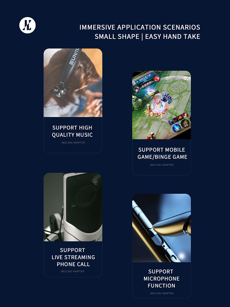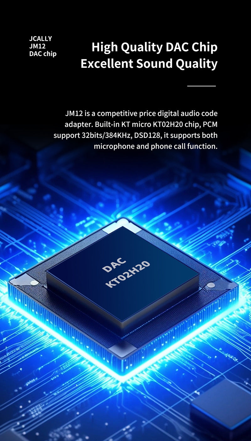 JM12 is a competitive price digital audio codeadapter. Built-in KT micro KT02H20 chip, PCMsupport 32bits/384KHz,DSD128, it supports bothmicrophone and phone call function.