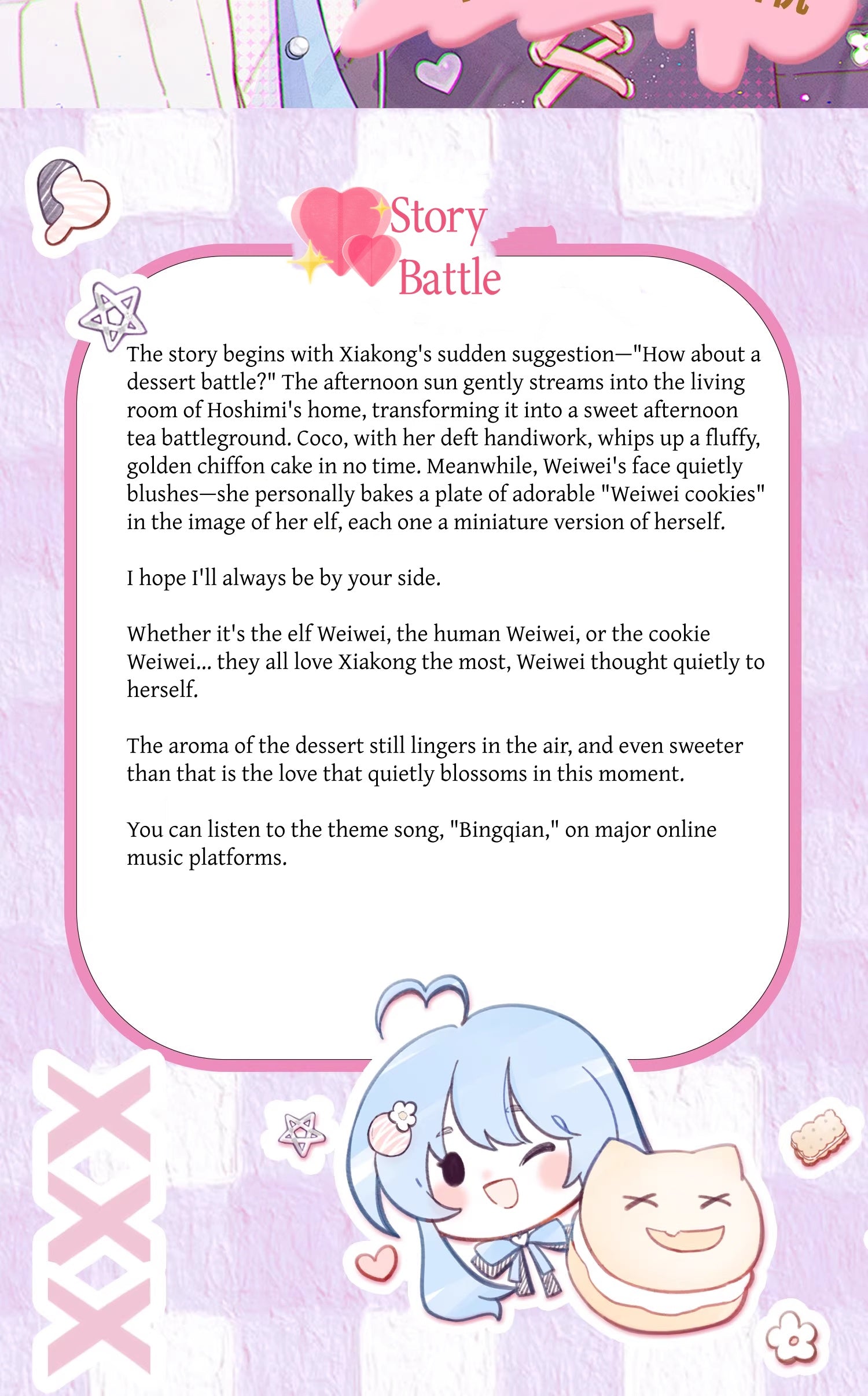 The story begins with Xiakong's sudden suggestion-"How about adessert battle?" The afternoon sun gently streams into the livingroom of Hoshimi's home, transforming it into a sweet afternoontea battleground, Coco, with her deft handiwork, whips up a fluffygolden chiffon cake in no time. Meanwhile, Weiwei's face quietlyblushes-she personally bakes a plate of adorable "'Weiwei cookies"in the image of her elf, each one a miniature version of herself.
