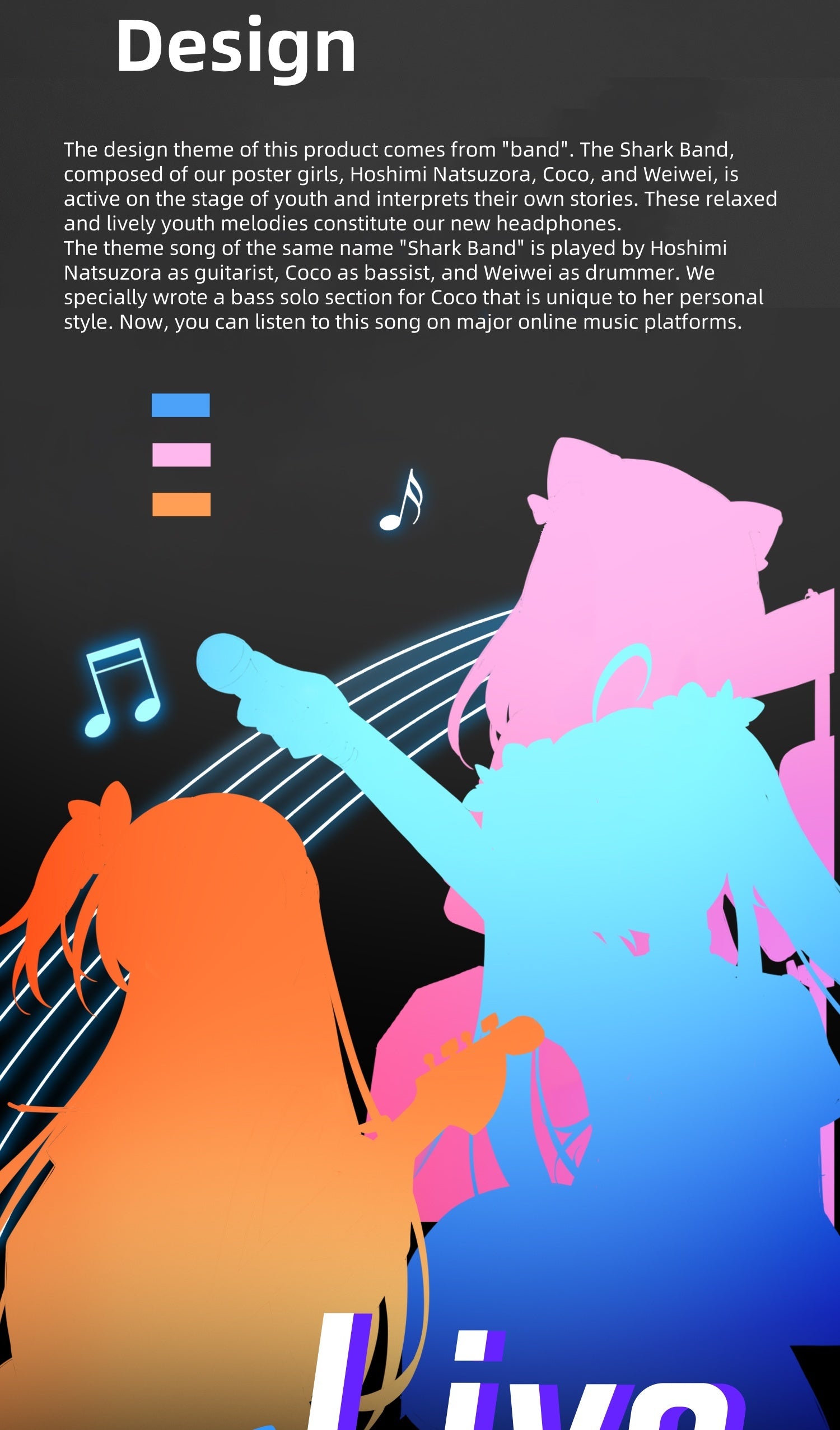 The design theme of this product comes from "band", The Shark Band,composed of our poster girls, Hoshimi Natsuzora, Coco, and Weiwei, isactive on the stage of youth and interprets their own stories. These relaxedand lively youth melodies constitute our new headphones.The theme song of the same name "Shark Band" is played by HoshimiNatsuzora as quitarist, Coco as bassist, and Weiwei as drummer. Wespecially wrote a bass solo section for Coco that is unique to her personalstyle. Now, you can listen to this song on major online music platforms.