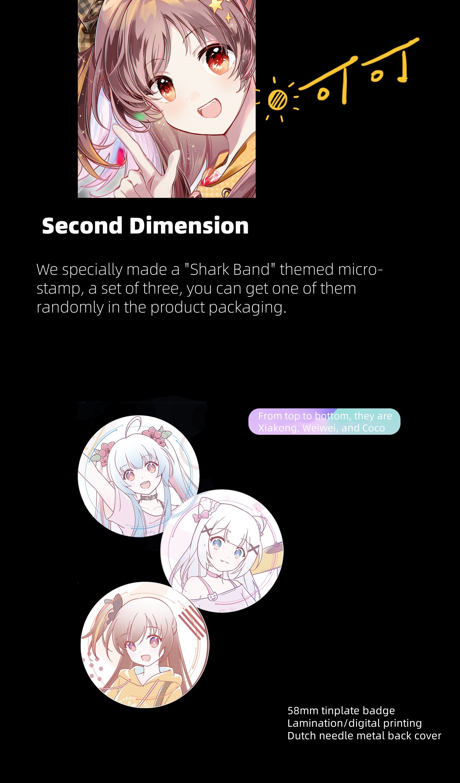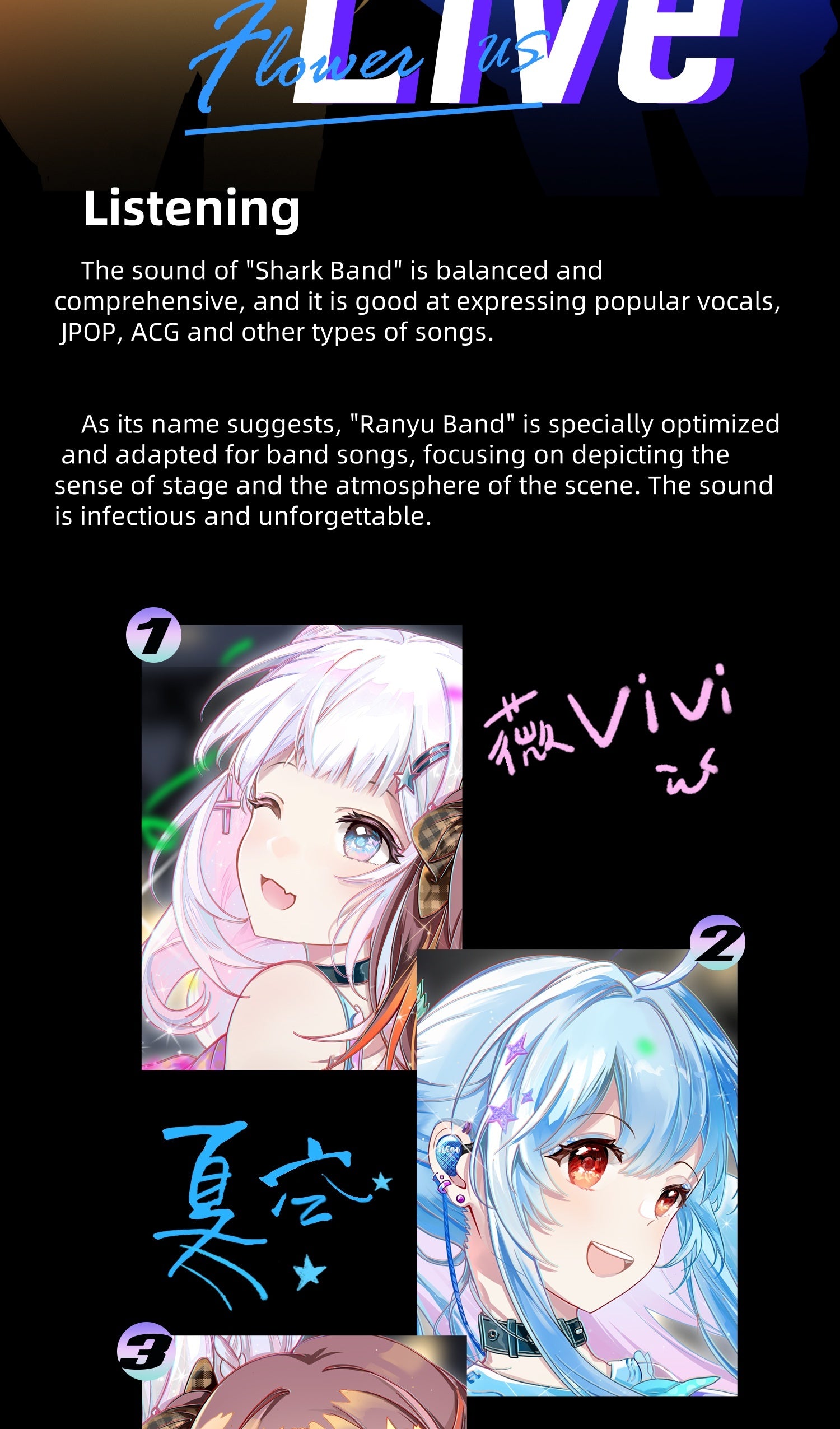 The design theme of this product comes from "band". The Shark Bandcomposed of our poster girls, Hoshimi Natsuzora, Coco, and Weiwei, isactive on the stage of youth and interprets their own stories. These relaxedand lively youth melodies constitute our new headphones.The theme song of the same name "Shark Band" is played by HoshimiNatsuzora as guitarist, Coco as bassist, and Weiwei as drummer. Wespecially wrote a bass solo section for Coco that is unique to her personalstyle. Now, you can listen to this song on major online music platforms.The sound of "Shark Band" is balanced andcomprehensive, and it is good at expressing popular vocalsJPOP, ACG and other types of songs.As its name suggests, "Ranyu Band" is specially optimizedand adapted for band songs, focusing on depicting thesense of stage and the atmosphere of the scene. The soundis infectious and unforgettable.