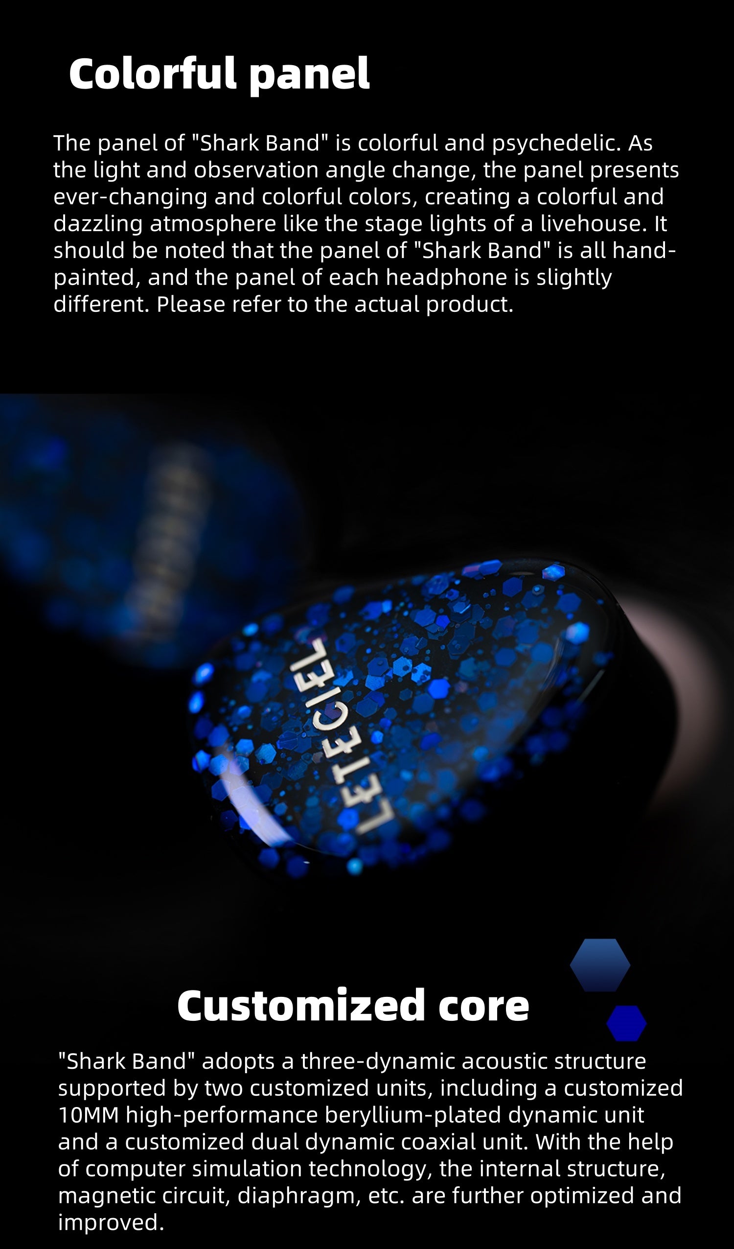 The panel of "Shark Band" is colorful and psychedelic. Asthe light and observation angle change, the panel presentsever-changing and colorful colors, creating a colorful anddazzling atmosphere like the stage lights of a livehouse. ltshould be noted that the panel of "Shark Band" is all hand-painted, and the panel of each headphone is slightlydifferent. Please refer to the actual product.