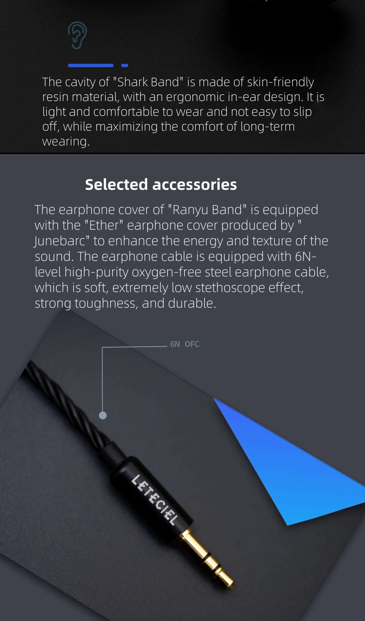 The earphone cover of "Ranyu Band" is equippedwith the "Ether" earphone cover produced by"Junebarc" to enhance the energy and texture of thesound. The earphone cable is equipped with óN-level high-purity oxygen-free steel earphone cable,which is soft, extremely low stethoscope effect,strong toughness, and durable