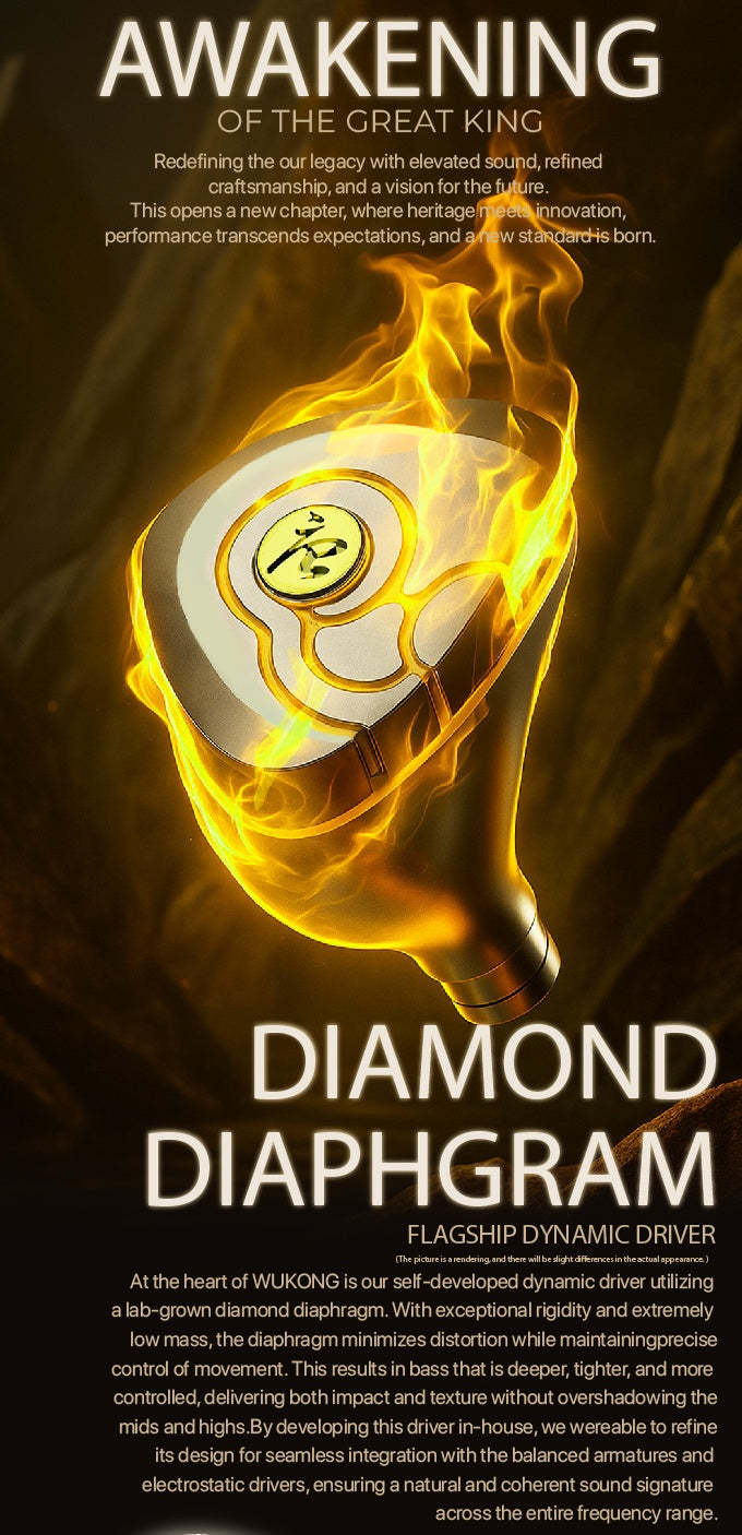 At the heart of WUKONG is our self-developed dynamic driver utilizinga lab-grown diamond diaphragm, With exceptional rigidity and extremelylow mass, the diaphragm minimizes distortion while maintainingprecisecontrol of movement.This results in bass that is deeper, tighter, and morecontrolled, delivering both impact and texture without overshadowing themids and highs.By developing this driver in-house, we wereable to refineits design for seamless integration with the balanced amatures andelectrostatic drivers, ensuring a natural and coherent sound signature across the entire frequency range,