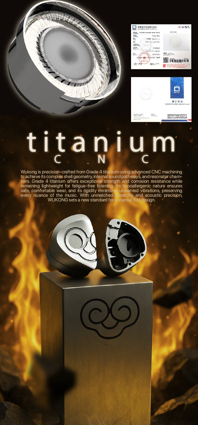 Wukong is precision-crafted from Grade 4 titanlum using advanced CNC machiningto achieve its complex shell geometry,interal sound pathways, and resonator chambers, Grade 4 titanium offers exceptional strength and corrosion resistance whileremaining lightweight for fatigue-free listening, its hypoallergenic nature ensuressafe, comfortable wear, and its rigidity minimizunwanted vibrations, preservingevery nuance of the music. With unmatchedlrability and acoustic precision,WUKONe sets a new standard foriversal IEN design