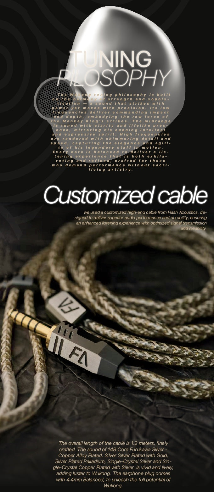 The overall length of the cable is 1.2 meters, fine)ycrafted, The sound of 148 Core Furukawa Sikver-Copper Alloy Pated, Silver Silver Plated wih Gold,Silver Plated Palladium, Single-Crystal Silver and Sin-ge-Crystal Copper Plated with Silver, is vivid and lively,adding uster to Wukong, The earphone pug comeswith 4,4mm Balanced, to unleash the ful potential ofWukong.