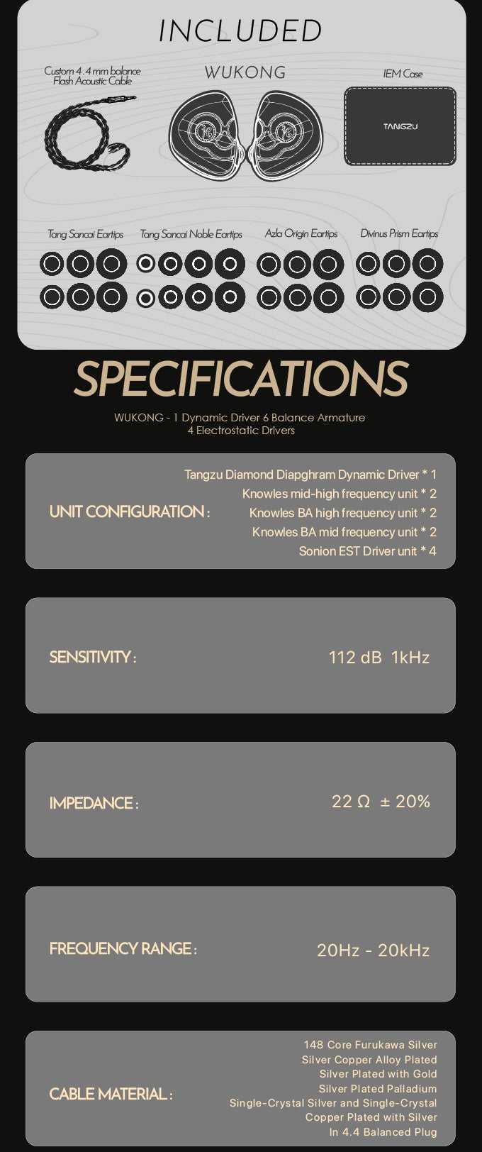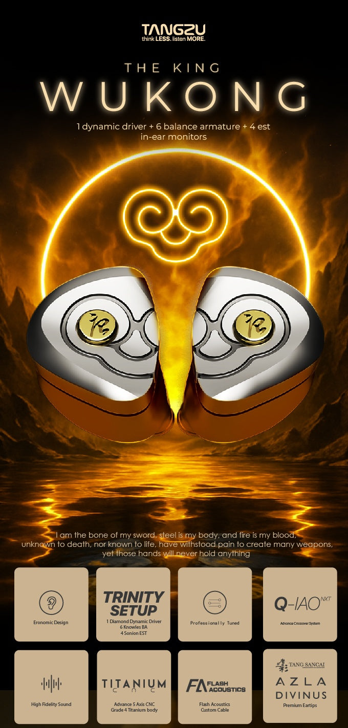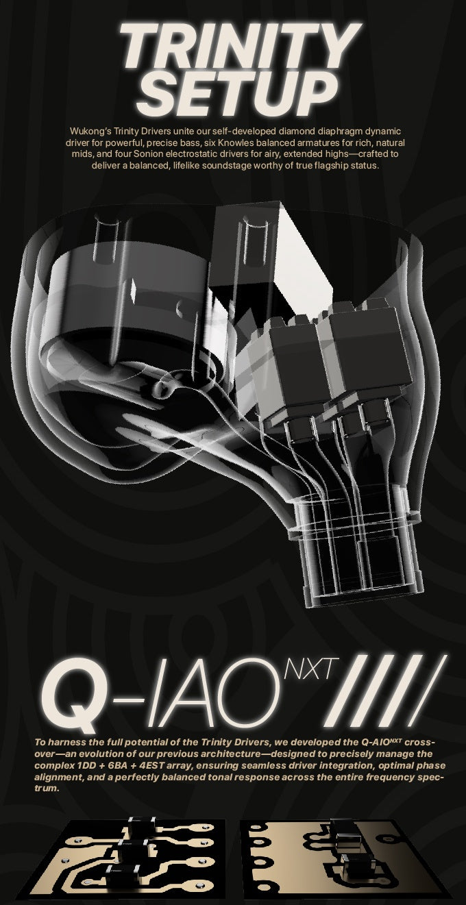 Wukong's Tinity Drivers unite our self-developed dlamond diaphragm dynamicdriver for powerful, precise bass, six Knowes balanced armatures for rich, naturalmids, and four Sonion electrostatic drivers for airy, extended highs crafted todeliver a balanced, lifelike soundstage worthy of true flagship status.