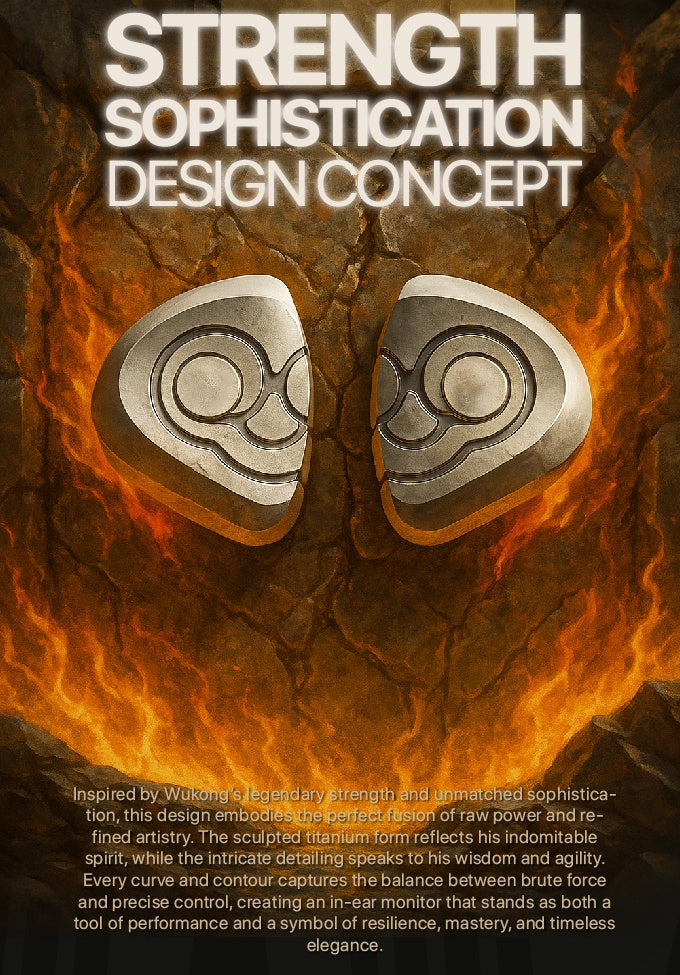 Inspired by Wukong 's legendary strength and unmatched sophistica-tion, this design embodies the perfect fusion of raw power and re-fined artistry. The sculpted titanium form reflects his indomitablespirit, while the intricate detailing speaks to his wisdom and agility.Every curve and contour captures the balance between brute forceand precise control, creating an in-ear monitor that stands as both atool of performance and a symbol of resilience,mastery, and timeless