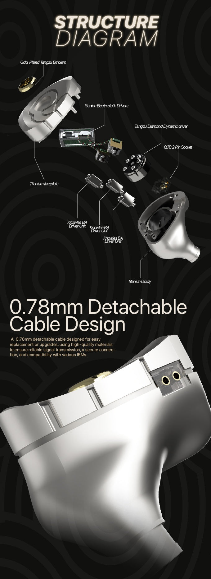 UNIT CONFIGURATION : Tangzu Diamond Diapghram Dynamic Driver * 1Knowles mid-high frequency unit *2Knowles BA high frequency unit * 2Knowes BA mid frequency unit * 2