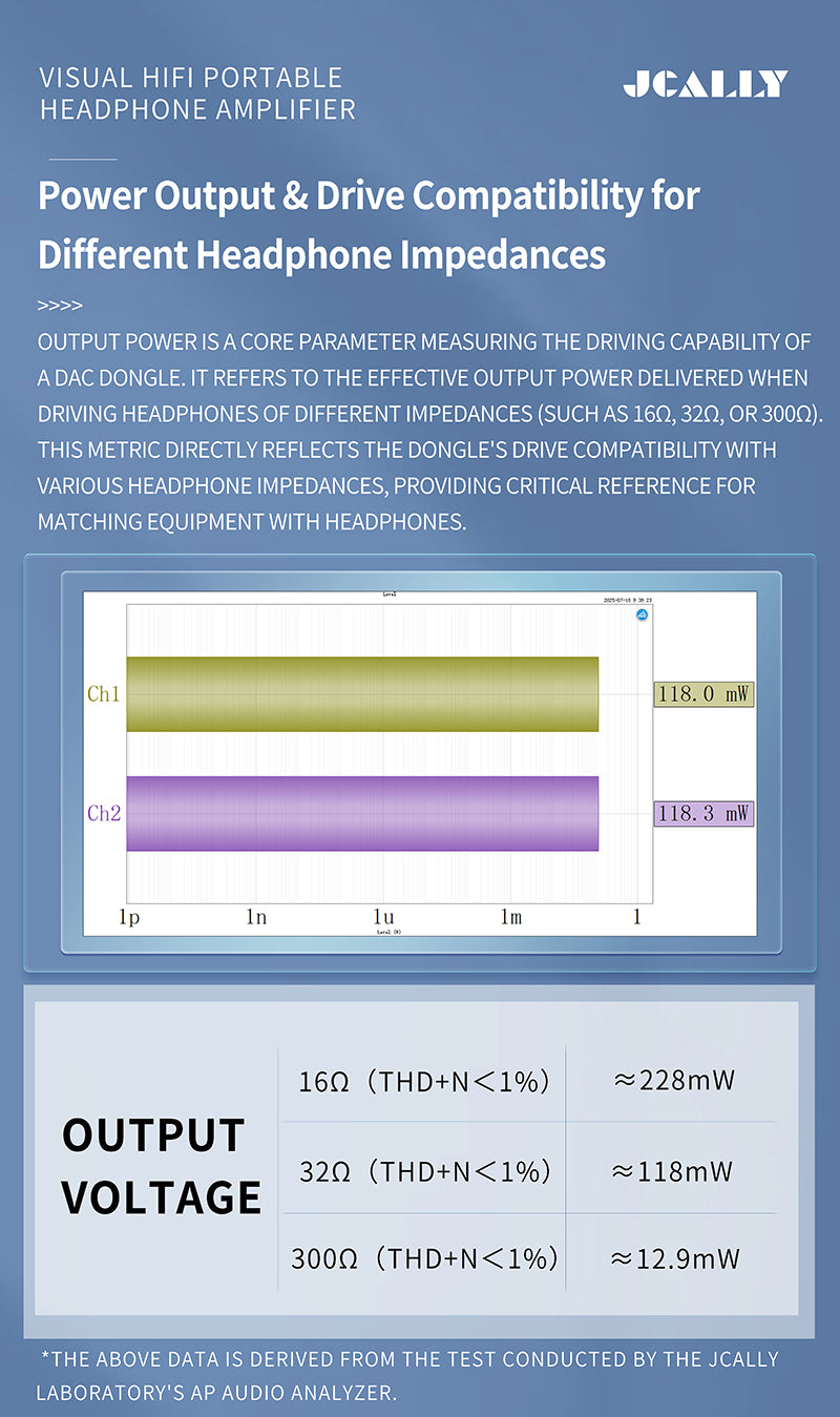 OUTPUT POWER IS A CORE PARAMETER MEASURING THE DRIVING CAPABILITY OFA DAC DONGLE. IT REFERS TO THE EFFECTIVE OUTPUT POWER DELIVERED WHENDRIVING HEADPHONES OF DIFFERENT IMPEDANCES (SUCH AS 16Q, 32Q, OR 300Q)THIS METRIC DIRECTLY REFLECTS THE DONGLE'S DRIVE COMPATIBILITYWITHVARIOUS HEADPHONE IMPEDANCES, PROVIDING CRITICAL REFERENCE FORMATCHING EQUIPMENT WITH HEADPHONES