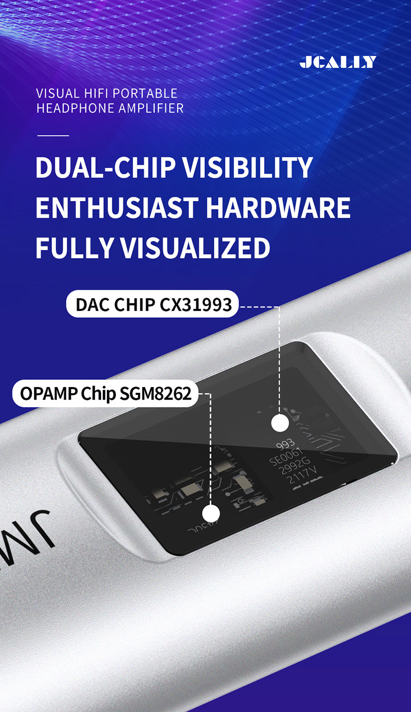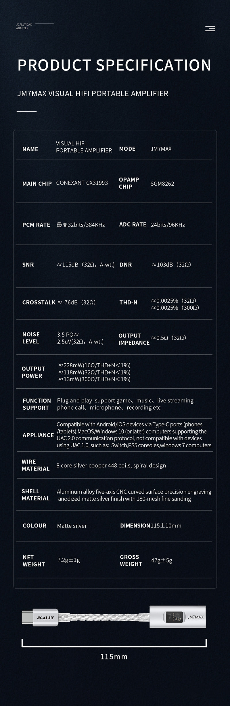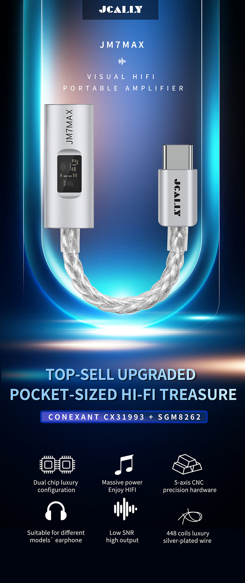 JM7MAX utilizes the Conexant CX31993 DAC chip, supporting PCM sampling ratesup to 32-bit/384kHz. Powerfully equipped with the SGM8262 amplifier chip, itdelivers exceptional driving capability for high-resolution audio reproduction.Experience authoritative low-end response and enhanced vocal clarity. Forrecording, a high-definition ADC chip supports 24-bit/96kHz capture.Comprehensive functionality includes music playback, inline controls,voice calling, and live broadcasting