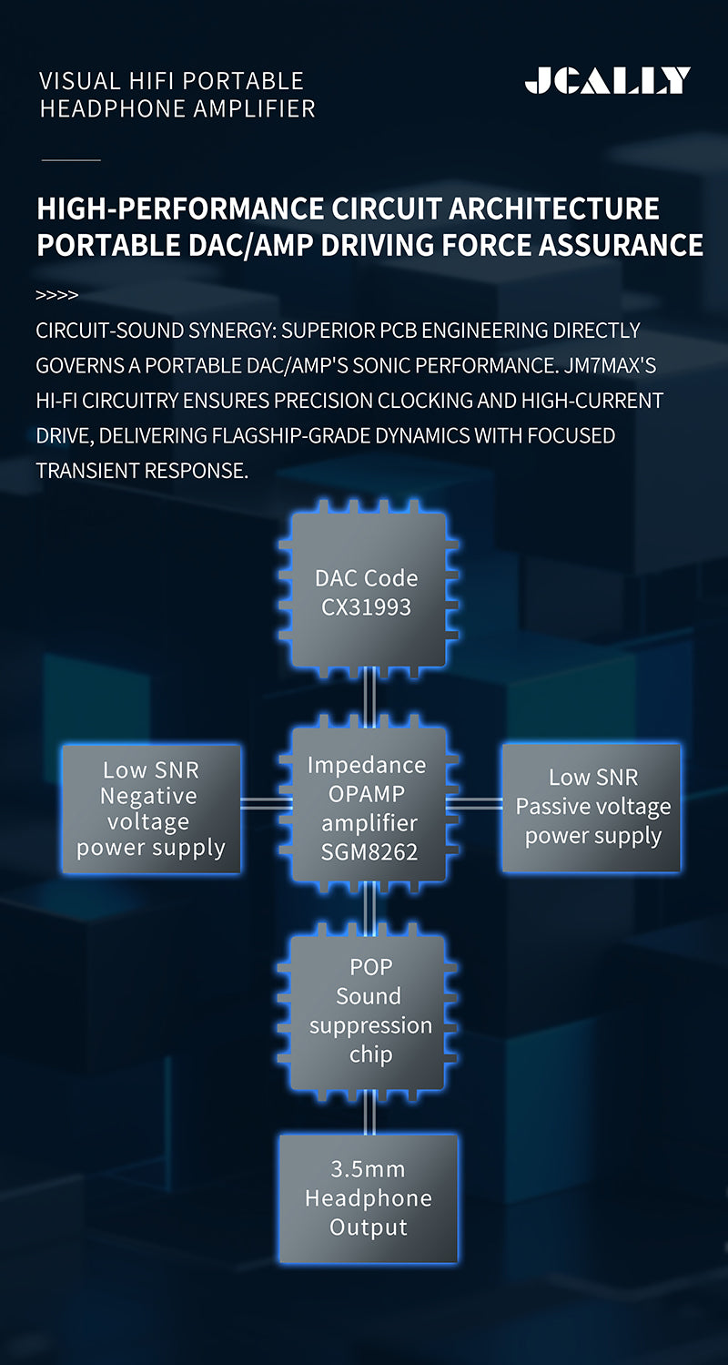 CIRCUIT-SOUND SYNERGY: SUPERIOR PCB ENGINEERING DIRECTLYGOVERNS A PORTABLE DAC/AMP'S SONIC PERFORMANCE. JM7MAX'SHI-FI CIRCUITRY ENSURES PRECISION CLOCKING AND HIGH-CURRENTDRIVE. DELIVERING FLAGSHIP-GRADE DYNAMICS WITH FOCUSEDTRANSIENT RESPONSE.