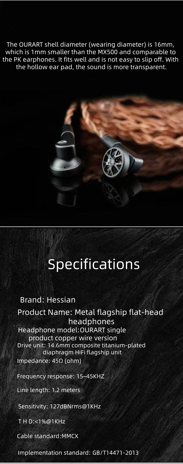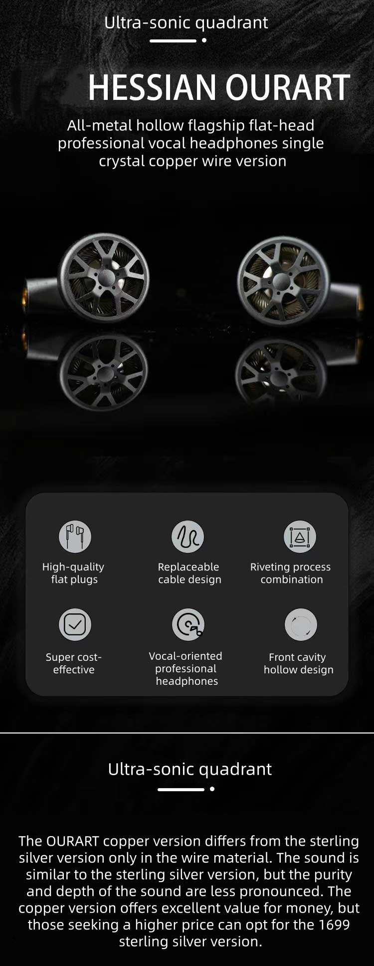 Product Name:Metalflagship flat-headheadphonesHeadphone model:OURART singleproduct copper wire versionDrive unit: 14.6mm composite titanium-plateddiaphragm HiFi flagship unit