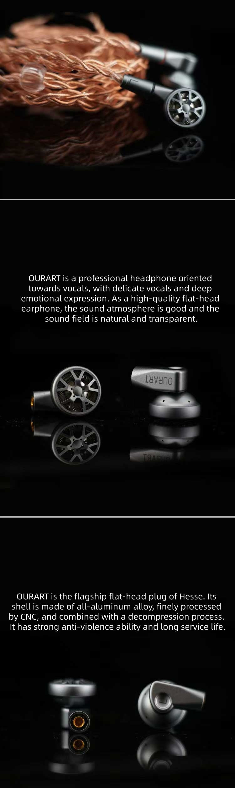 OURART is a professionalheadphone orientedtowards vocals, with delicate vocals and deepemotional expression.As a high-quality flat-headearphone, the sound atmosphere is good and thesound field is natural and transparent.