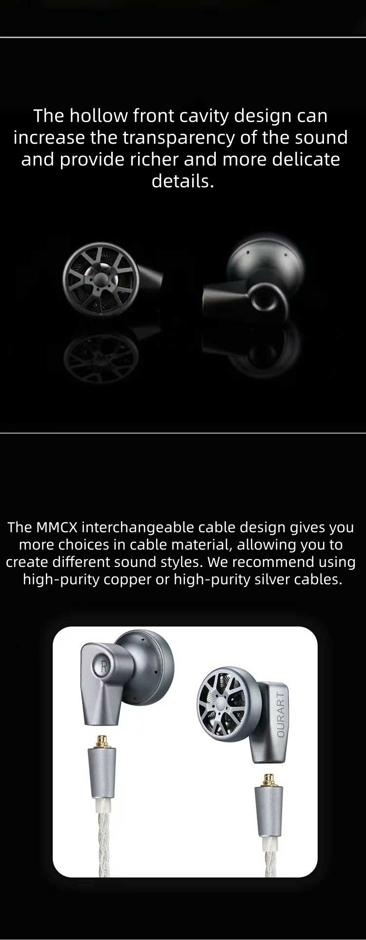 The MMCXinterchangeable cable design gives youmore choices in cable material, allowing you tocreate different sound styles. We recommend usinghigh-purity copper or high-purity silver cables.