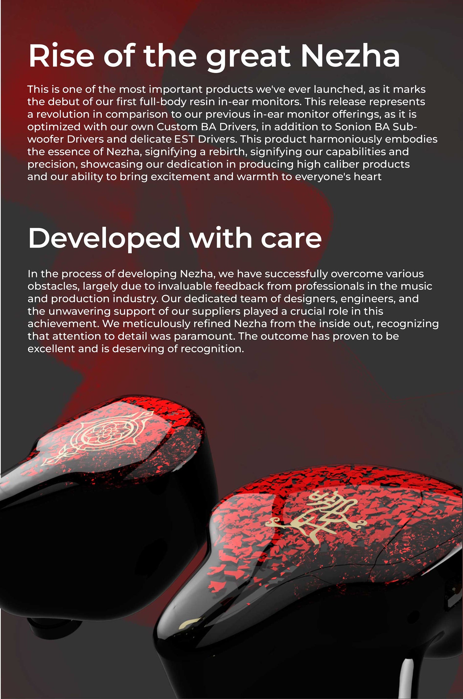 This is one of the most important products we've ever launched, as it marksthe debut of our first full-body resin in-ear monitors, This release representsa revolution in comparison to our previous in-ear monitor offerings, as it isoptimized with our own Custom BA Drivers, in addition to Sonion BA Sub.woofer Drivers and delicate EST Drivers. This product harmoniously embodiesthe essence of Nezha, signifying a rebirth, signifying our capabilities andprecision, showcasing our dedication in producing high caliber productsand our ability to bring excitement and warmth to everyone's heart