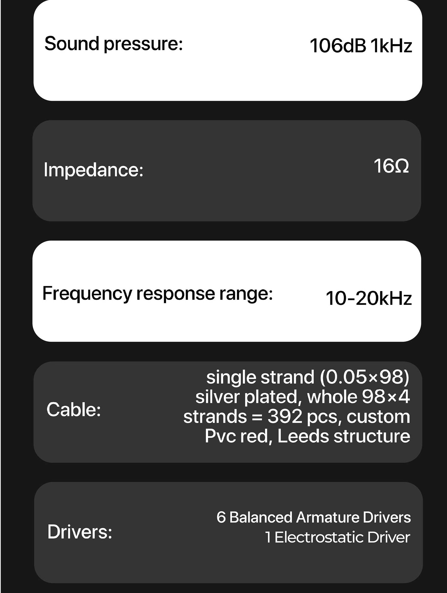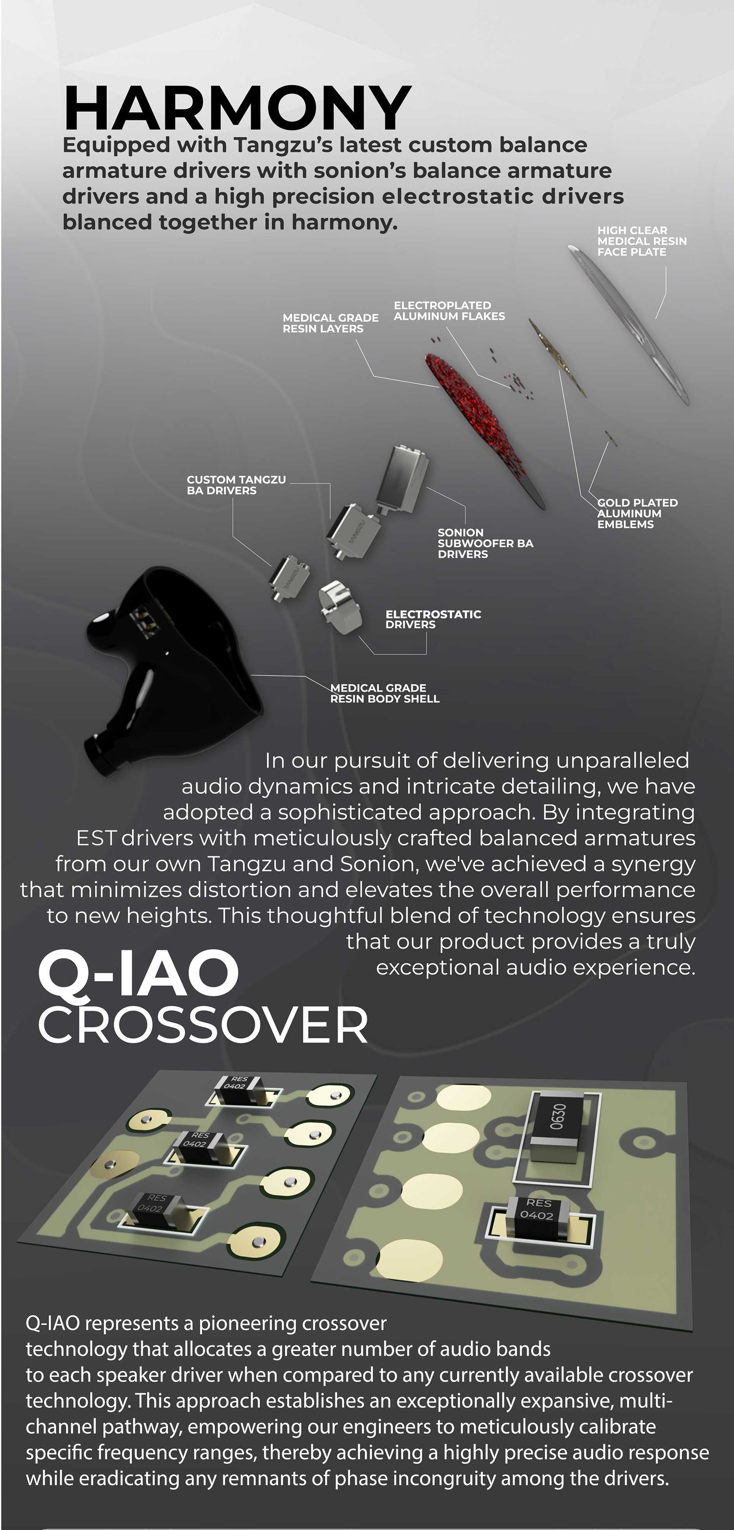 In our pursuit of delivering unparalleledaudio dynamics and intricate detailing, we haveadopted a sophisticated approach.ByintegratingESTdrivers with meticulously crafted balanced armaturesfrom our own Tangzu and Sonion, we've achieved a synergythat minimizes distortion and elevates the overall performanceto new heights. This thoughtful blend of technology ensuresthat our product provides a trulyexceptional audio experience,
