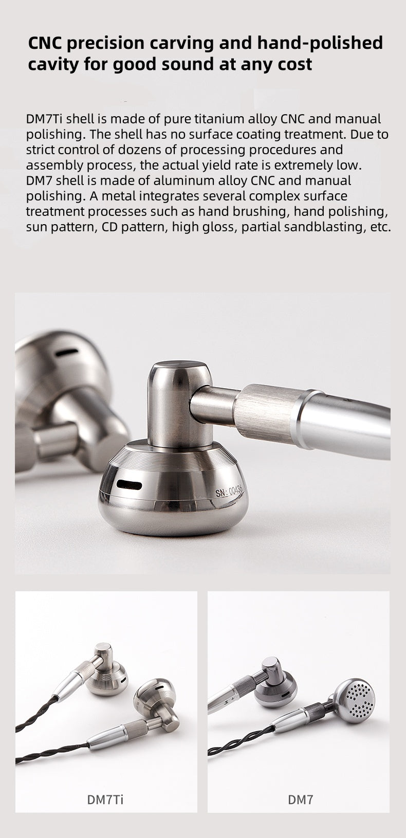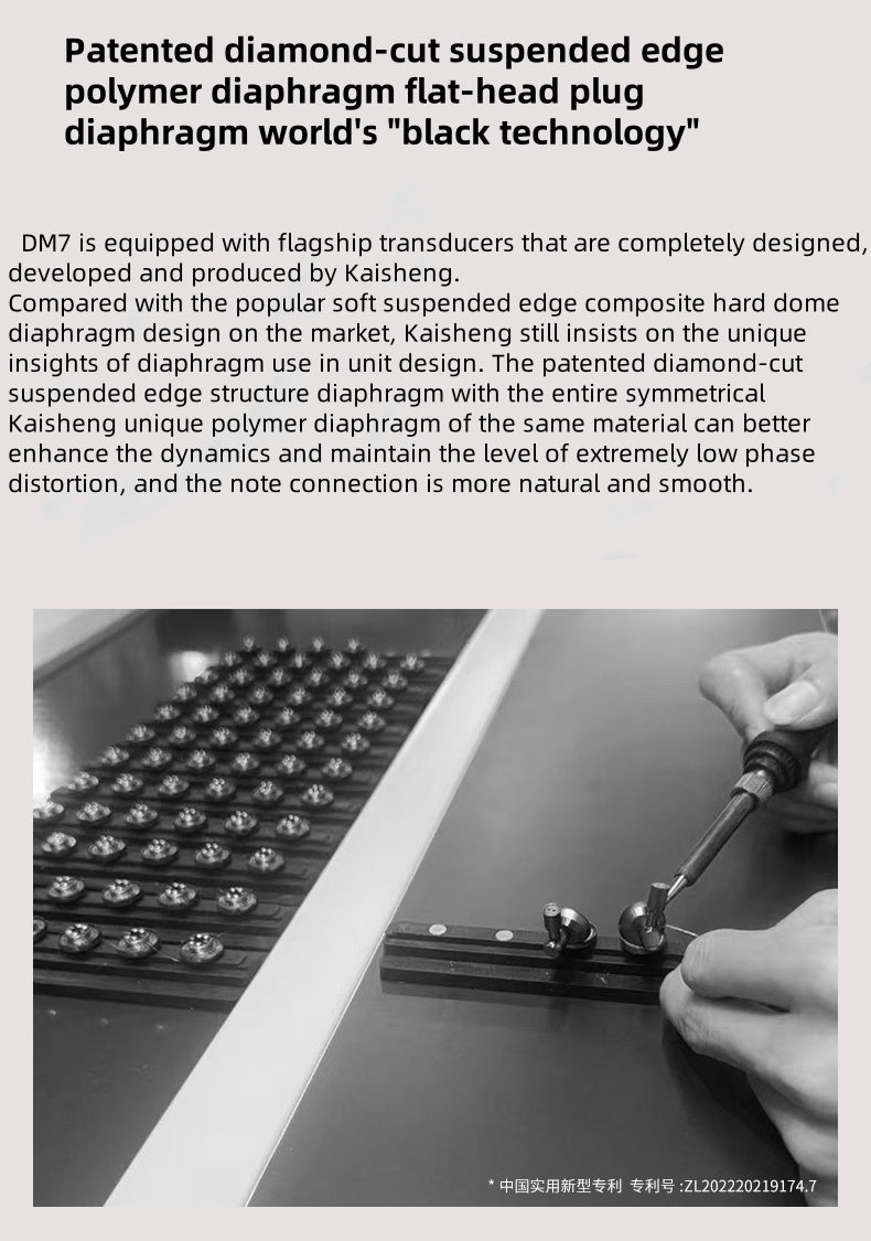 DM7 is equipped with flagship transducers that are completely designeddeveloped and produced by Kaisheng.Compared with the popular soft suspended edge composite hard domediaphragm design on the market, Kaisheng still insists on the uniqueinsights of diaphragm use in unit design. The patented diamond-cutsuspended edge structure diaphragm with the entire symmetricalKaisheng unique polymer diaphragm of the same material can betterenhance the dynamics and maintain the level of extremely low phasedistortion, and the note connection is more natural and smooth.