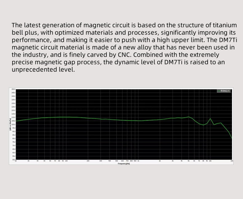 The latest generation of maqnetic circuit is based on the structure of titaniumbell plus, with optimized materials and processes, significantly improving itsperformance, and making it easier to push with a high upper limit. The DM7Tmagnetic circuit material is made of a new alloy that has never been used inthe industry, and is finely carved by CNc, Combined with the extremelyprecise magnetic gap process, the dynamic level of DM7Ti is raised to anunprecedented level.