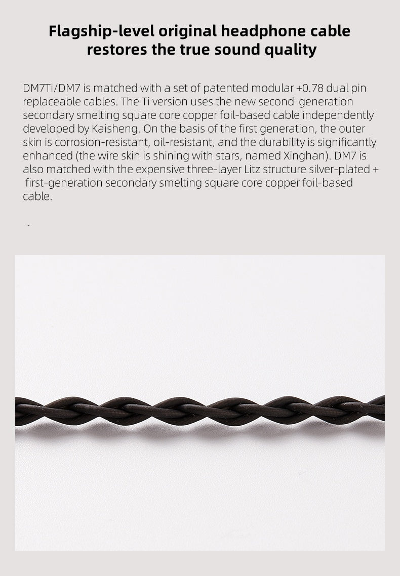 DM7Ti/DM7 is matched with a set of patented modular +0.78 dual pinreplaceable cables. The Tiversion uses the new second-generationsecondarysmelting square core copper foil-based cable independentlydeveloped by Kaisheng, On the basis of the first generation, the outerskin is corrosion-resistant, oil-resistant, and the durabilityis significantlyenhanced (the wire skin is shining with stars, named Xinghan). DM7 isalso matched with the expensive three-layer Litz structure silver-plated +first-generation secondary smelting square core copper foil-basedcable.