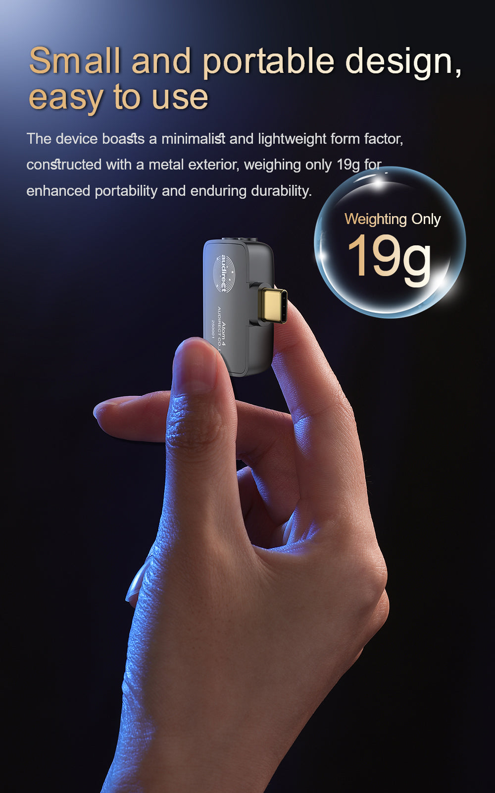 The device boasts a minimalist and lightweight form factor,constructed with a metal exterior, weighing only 19g for enhanced portability and enduring durability.