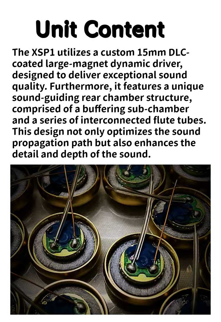 The XSPl utilizes a custom 15mm DLCcoated large-magnet dynamic driverdesigned to deliver exceptional soundquality. Furthermore, it features a uniquesound-guiding rear chamber structure,comprised of a buffering sub-chamberand a series ofinterconnected flute tubesThis design not only optimizes the soundpropagation path but also enhances thedetail and depth of the sound.