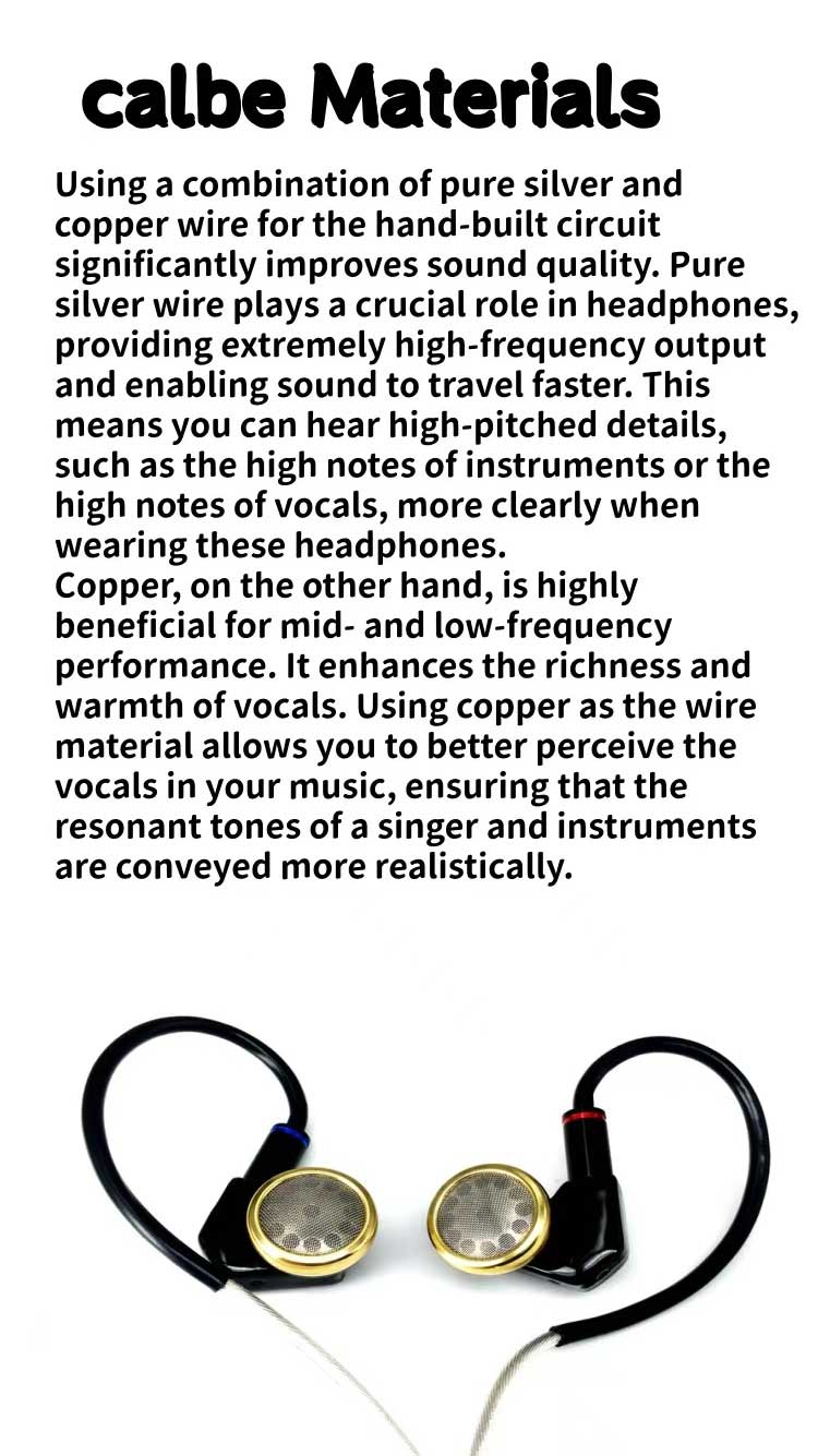 Using a combination of pure silver andcopper wire for the hand-built circuitsignificantly improves sound quality. Puresilver wire plays a crucial role in headphones,providing extremely high-frequency outputand enabling sound to travel faster. Thismeans you can hear high-pitched details.such as the high notes ofinstruments or thehigh notes of vocals, more clearly whenwearing these headphones.Copper, on the other hand, is highlybeneficial for mid- and low-frequencyperformance.lt enhances the richness andwarmth of vocals. Using copper as the wirematerial allows you to better perceive thevocals in your music, ensuring that theresonant tones of a singer and instrumentsare conveyed more realistically.
