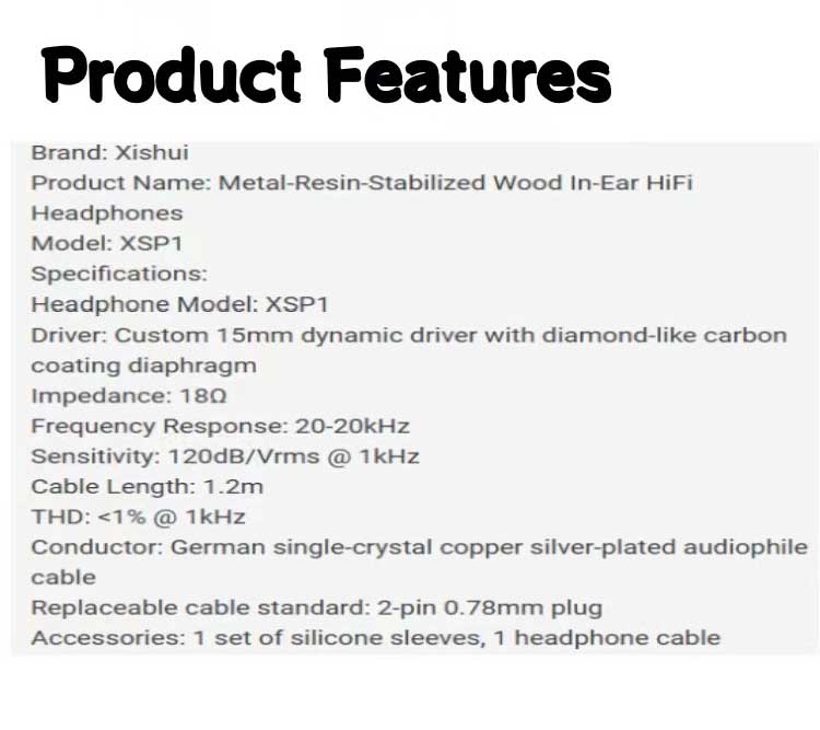 Brand: XishuiProduct Name: Metal-Resin-Stabilized Wood In-Ear HiFiHeadphonesModel: xSP1Specifications:Headphone Model: XSP1Driver: Custom 15mm dynamic driver with diamond-like carboncoating diaphragmImpedance:180