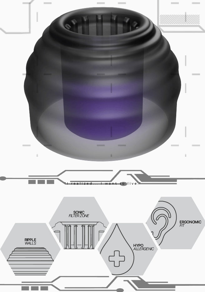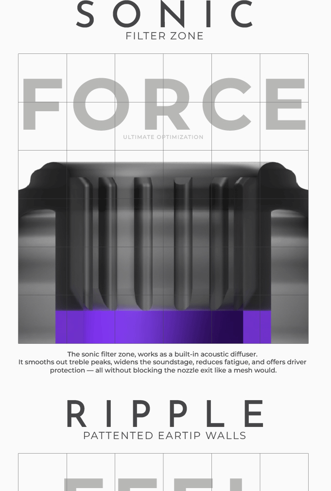The Sonic Filtering Zone functions like a built-inacoustic amplifier. lt smooths high-frequency peaks,widens the soundstage, reduces listening fatigue, andprotects the drivers. lt also doesn't block the soundoutlet like a mesh filter.