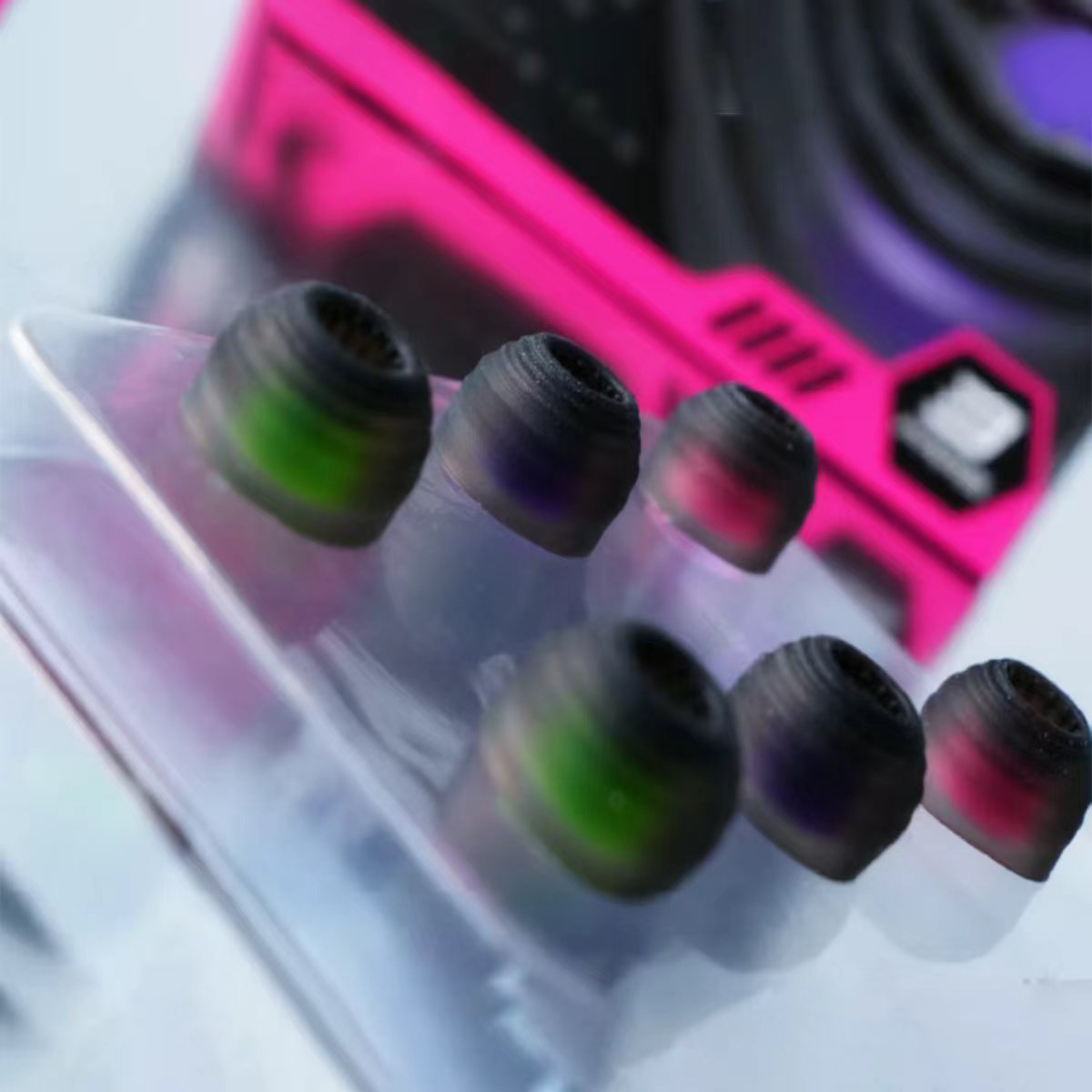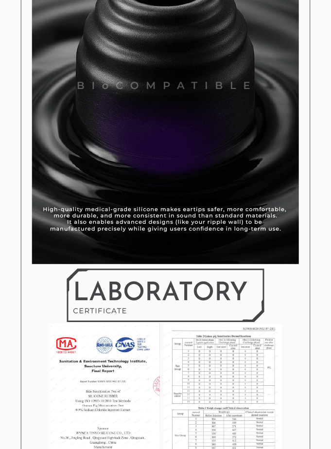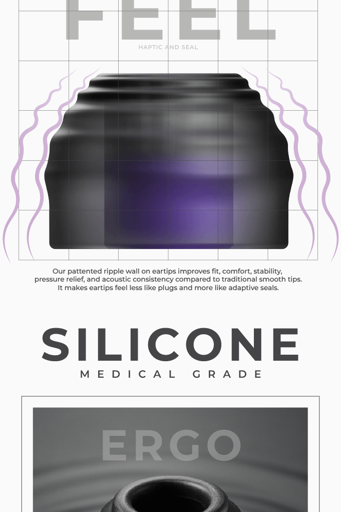 Earbud tips made from high-quality medical-gradesilicone offer a safer, more comfortable, and moredurable fit compared to standard materials, while alsoproviding more consistent sound performance. Thismaterial also allows for precise implementation ofadvanced designs (such as bellows) while providingusers with confidence in long-term performance
