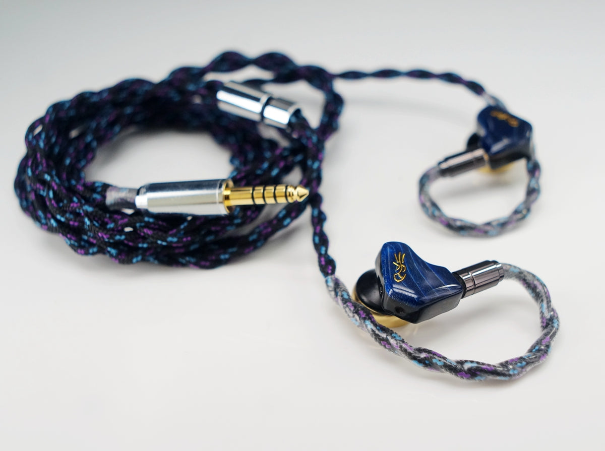 In terms of design, the housing features an in-ear monitor structure, and the back panel isconstructed from blue stabilized wood. Theprimary black color scheme, accented withroyal blue and gold accents, creates a subtleyet luxurious aesthetic.To easily distinguishbetween the left and right earbuds, the bluering pin represents the left earbud, and the redring pin represents the right earbud.
