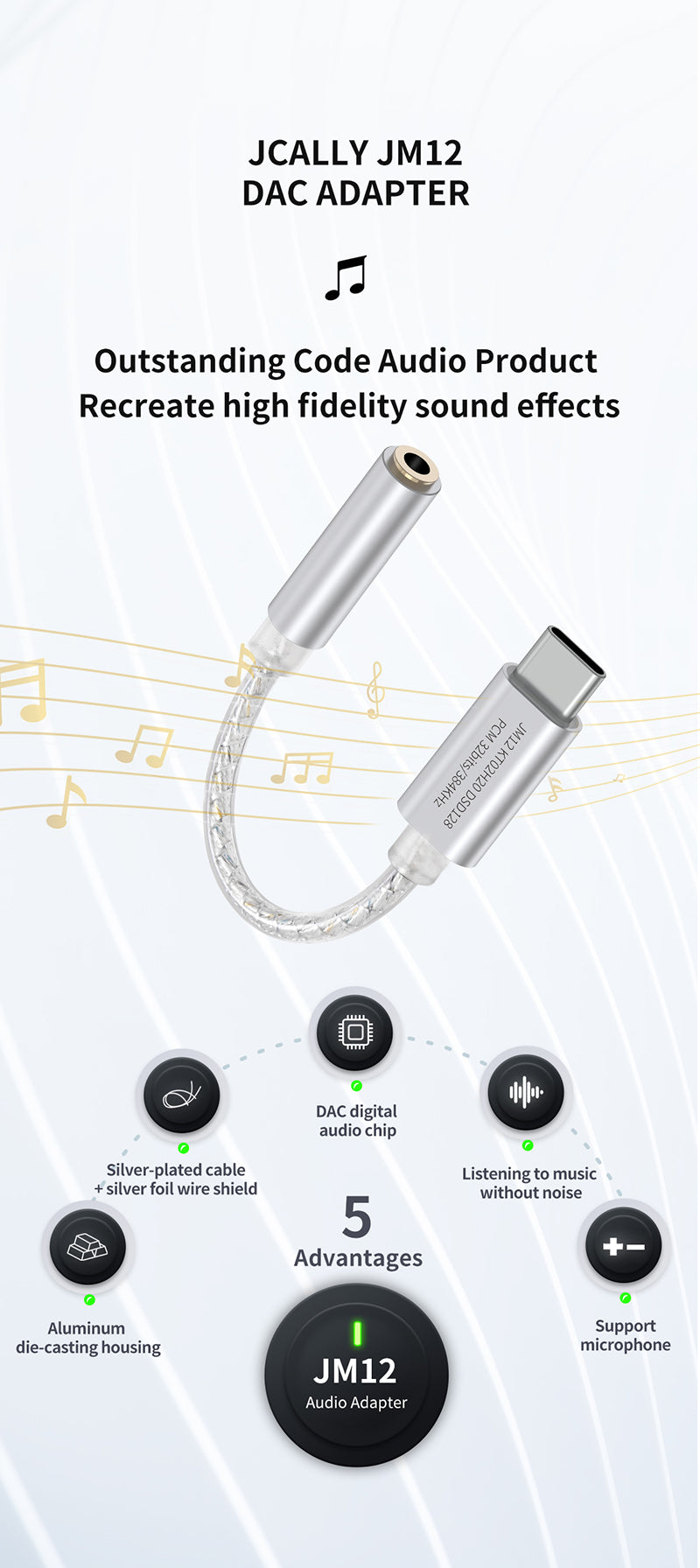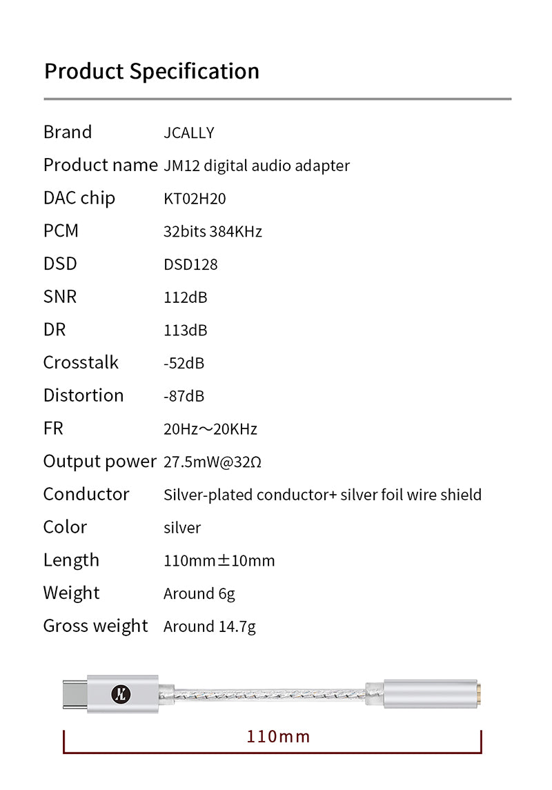 JM12 — это конкурентоспособный по цене цифровой аудиоадаптер. Встроенный чип KT micro KT02H20, PCM с поддержкой 32 бит/384 кГц и DSD128, а также функции микрофона и телефонного звонка.