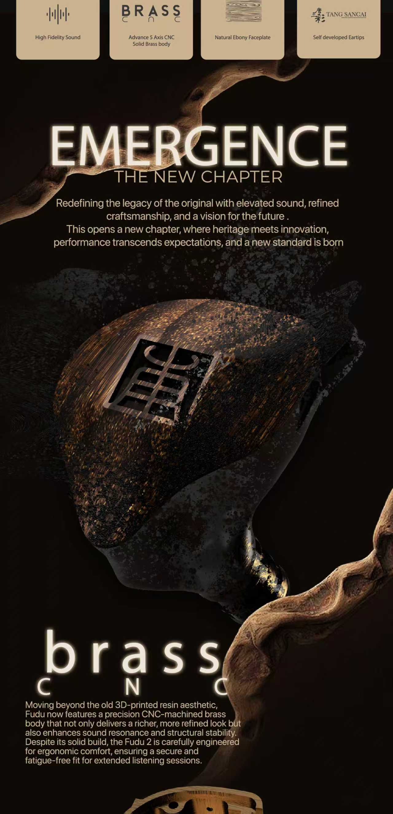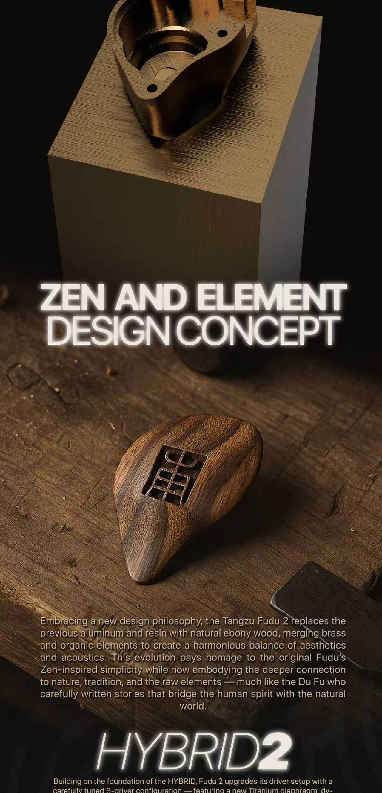 Embracing a new design philosophy, the Tangzu Fudu 2 replaces theprevious aluminum and resin with natural ebony wood, merging brassand organic elements to create a harmonious balance of aestheticsand acoustics. This evolution pays homage to the original Fudu'sZen-inspired simplicity while now embodying the deeper connectionto nature, tradition, and the raw elements - much like the Du Fu whocarefully written stories that bridge the human spirit with the natural worid.
