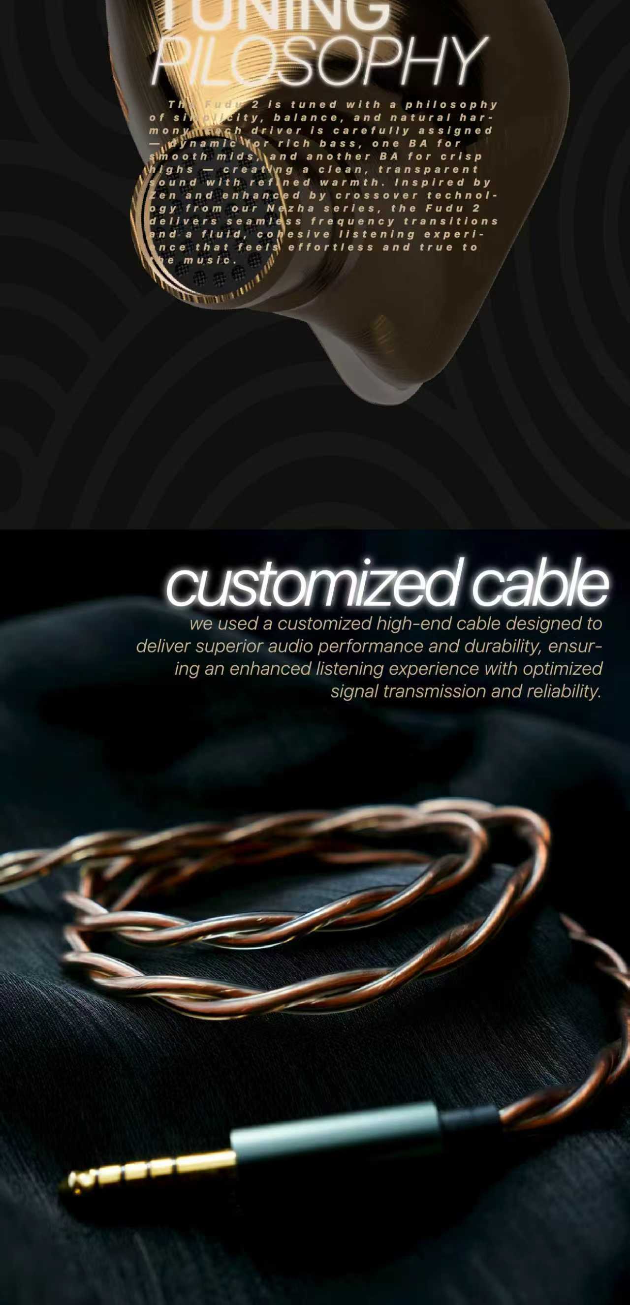 Building on the foundation of the HYBRlD, Fudu 2 upgrades its driver setup with a carefully tuned3-driver confiouration-featuring a new titanium dianhram dy-namic driver for thicker, more refined bass, a balanced armature dedicated to natural, detailed mids, and another for crisp, extended highs. This upgrade maximizes each irequeney's polential while staying true to our Zen-inspired philosophy olsimplicity and balance, going back to basics with purpose: to elevate every detai witheut unneeessary complexity.