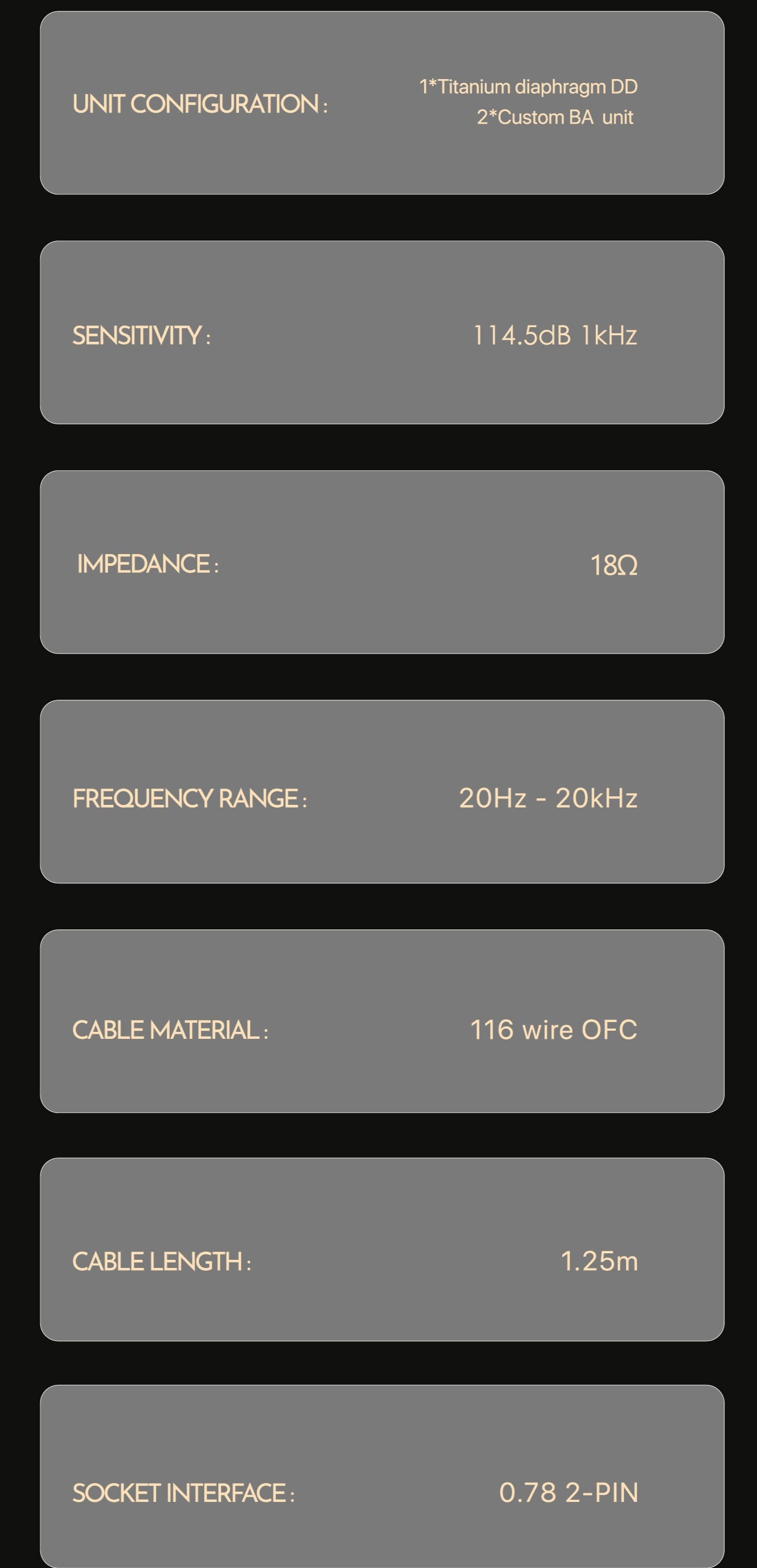UNIT CONFIGURATION :  1*Titanium diaphragm DD 2*Custom BA unit
