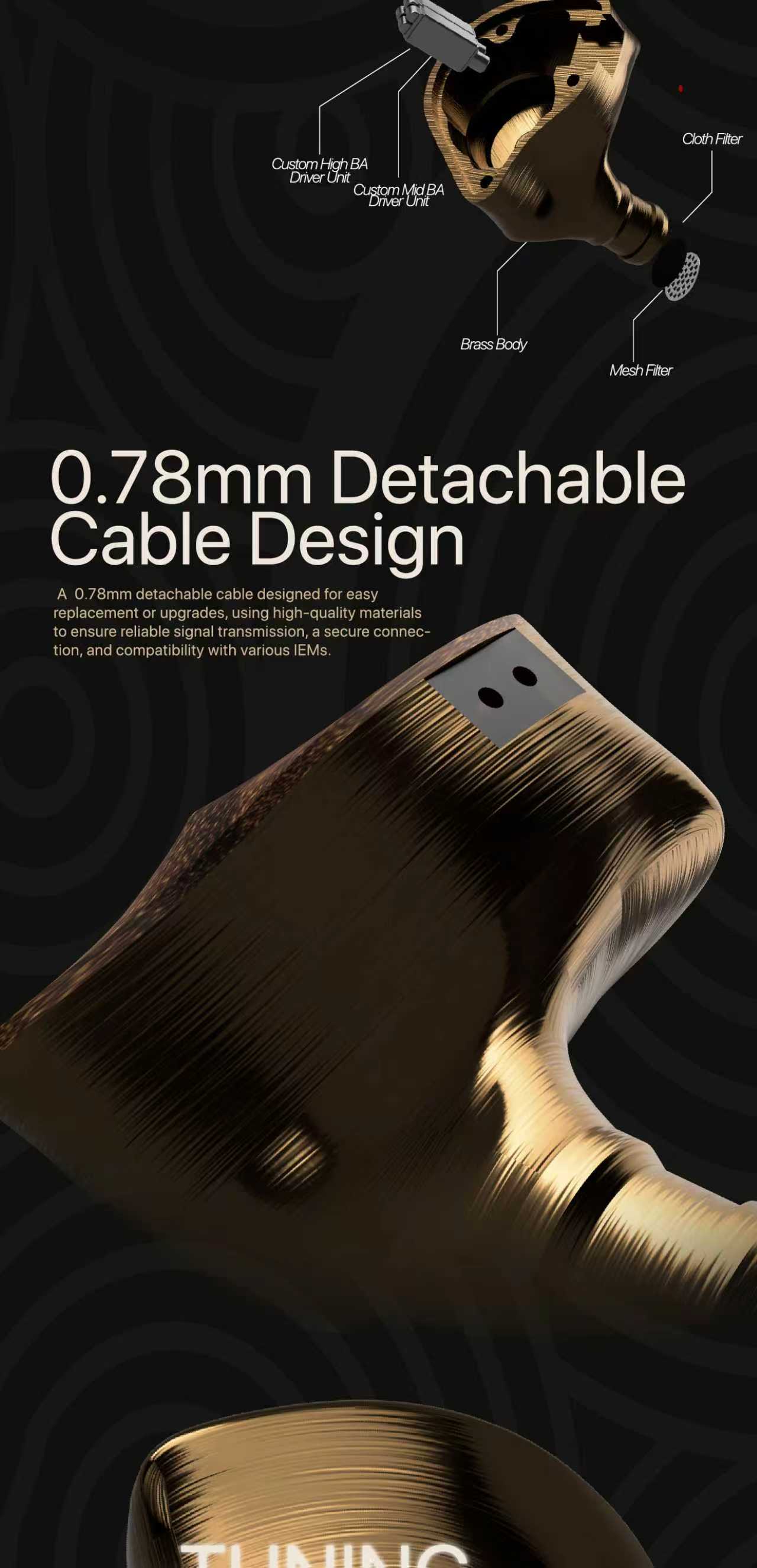 A 0.78mm detachable cable designed for easyreplacement or upgrades,using high-quality materialsto ensure religble signal transmission, a socure connection, and compatibilty with warious lEMs.