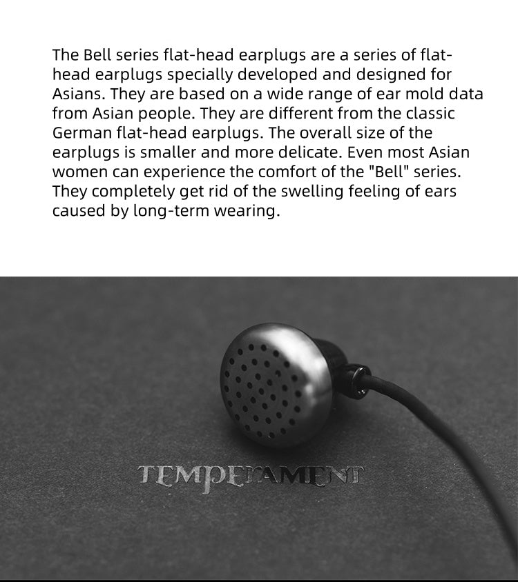 The Bell series flat-head earplugs are a series of flat-head earplugs specially developed and designed forAsians. They are based on a wide range of ear mold datafrom Asian people. They are different from the classicGerman flat-head earplugs. The overall size of theearplugs is smaller and more delicate.Even most Asianwomen can experience the comfort of the "Bell" series.They completely get rid of the swelling feeling of earscaused by long-term wearing
